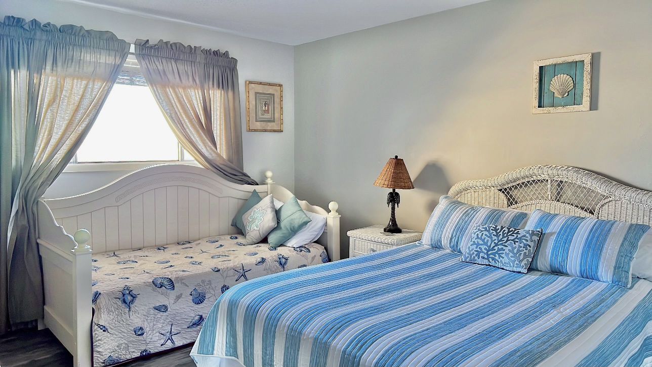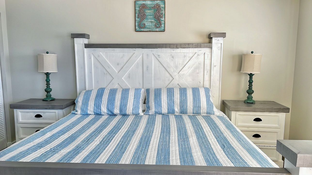 The master has a king size bed with views of the ocean and the second bedroom has a queen and a full bed. There is a queen size sleeper sofa in the living area which also has beach views. Two full baths. The kitchen is fully stocked. There are so many amenities on the property that you could chose to never leave the site! You will have the opportunity to enjoy amenities such as the tennis and shuffleboard courts, two large pools (one heated), hot tub, kiddie pool, billiard room (with pool table, darts, and card table). The pool area also sports the amazing Tiki Bar- BIKINI BOB'S with a full menu of cocktails, beer, wine, and food at great prices. To top off the experience, The Tiki Bar provides music throughout the day. There is also a great exercise room for your enjoyment. Regency Towers provides a large grassy park area to play Frisbee, soccer, throw a ball, etc. There are grills and beach front bench swings, perfect for grilling out and enjoying the brilliant sun sets as well. There are nightly events scheduled such as movie night on the East lawn at dusk, Water slides at the pool on Wednesdays, Karaoke on the pool deck, and especially fun is the beach bon fire on Friday nights. Panama City Beach has been hosting vacationers for many years and the entire area is full of fun things to do!