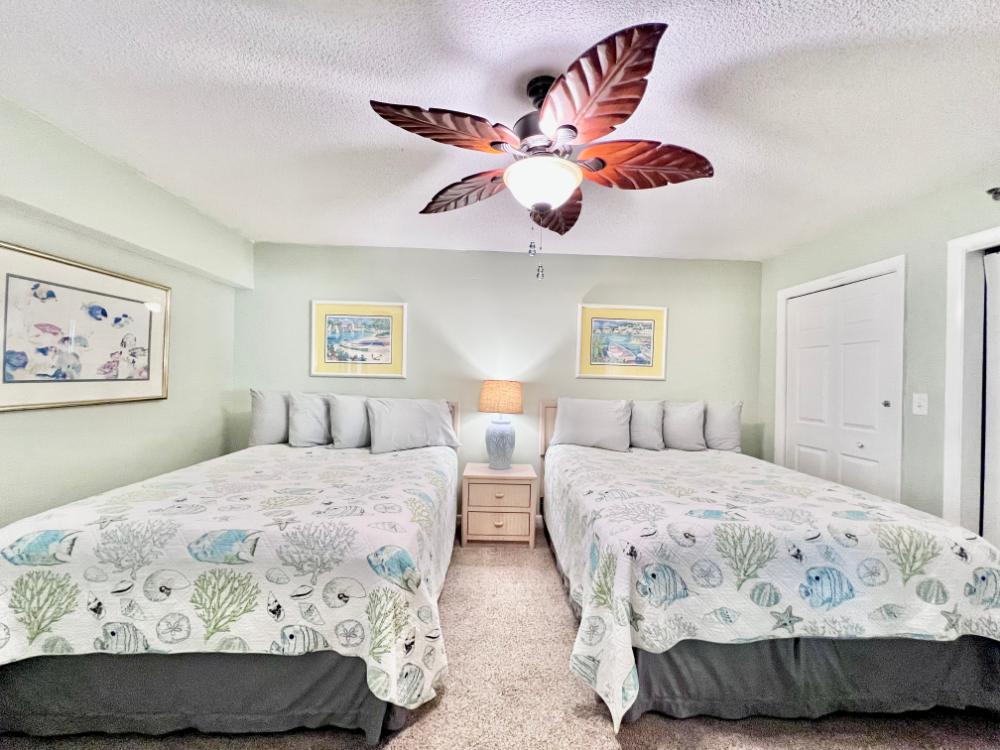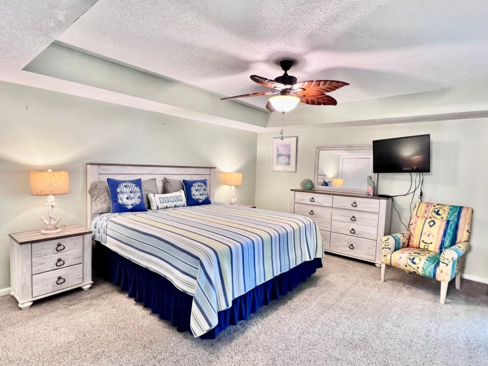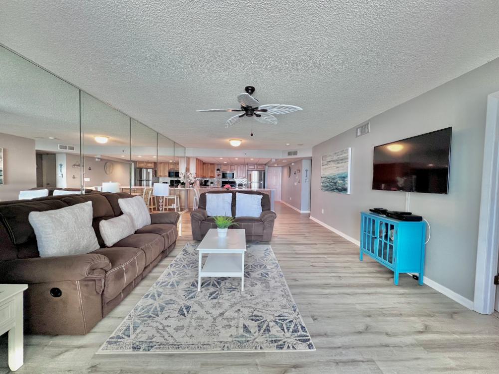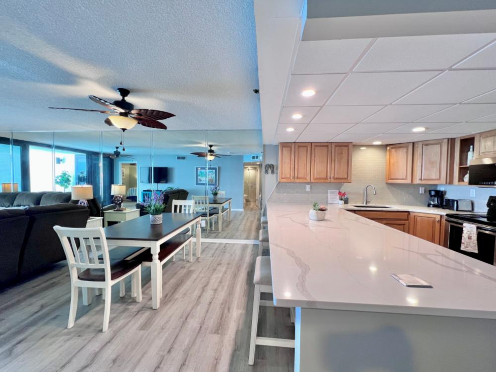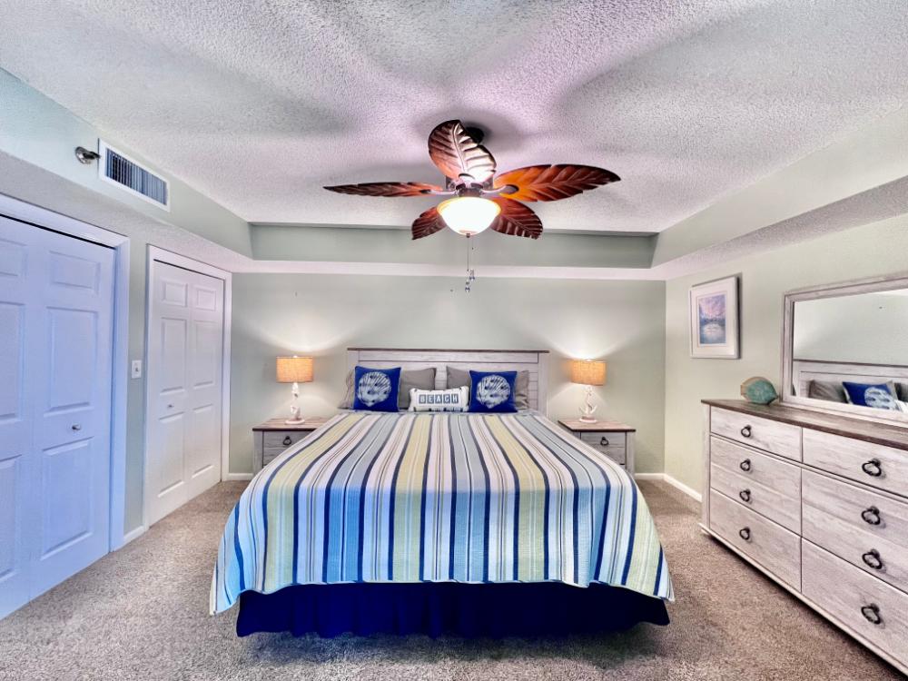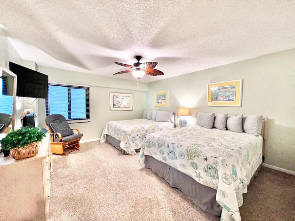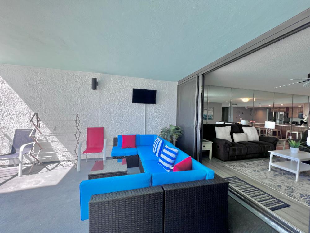 You will enjoy high quality furnishings and bedding throughout in this 1440 sq. ft. two bedroom and two bath condo. One of the most exciting perks of this condo is the large covered balcony. If truly feels like an extension of the interior, TV included! All new appliances, flooring, paint, and furnishings are your to enjoy! All bedrooms and the living room offer flat screen TV's. We "stream" our TV services. Netflix, YouTube TV and many others are available allowing you to watch endless movies, news channels and the local channels. The kitchen is stocked with every gadget you'll need to prepare a gourmet meal – all you need to do is decide if you want to eat inside at the dining table or outside on the covered balcony – both have fantastic water views and spectacular sunsets! The master bedroom has a king size bed and the second large bedroom has two queen size beds. In the living room you have available 2 twin size cots allowing you to sleep comfortably 8 people. This unit also comes with FREE BEACH SERVICE!
