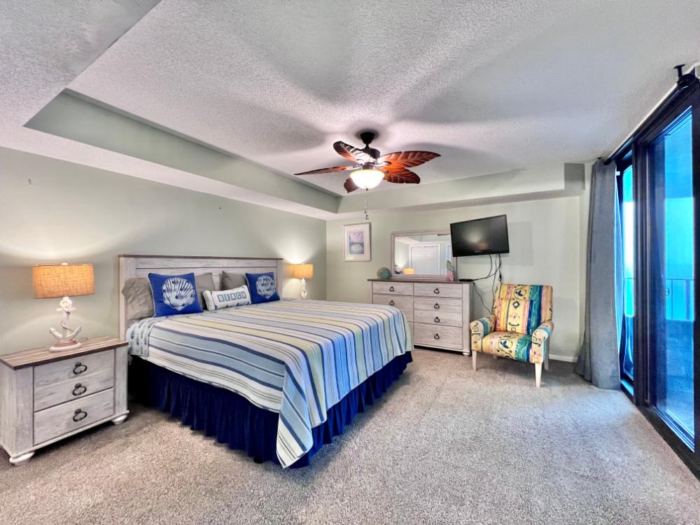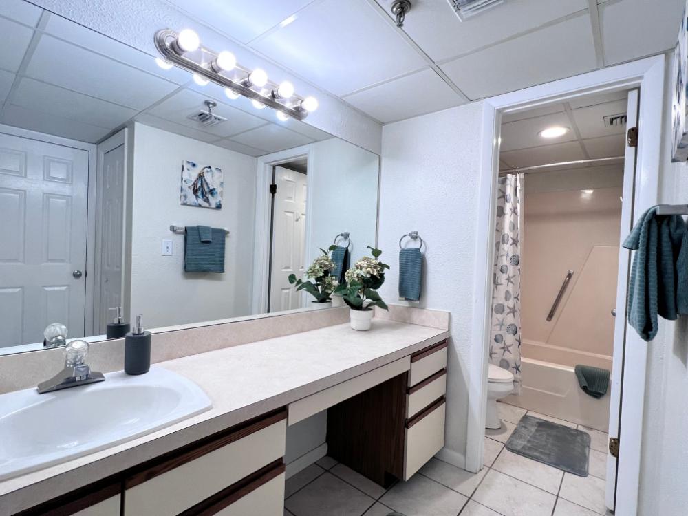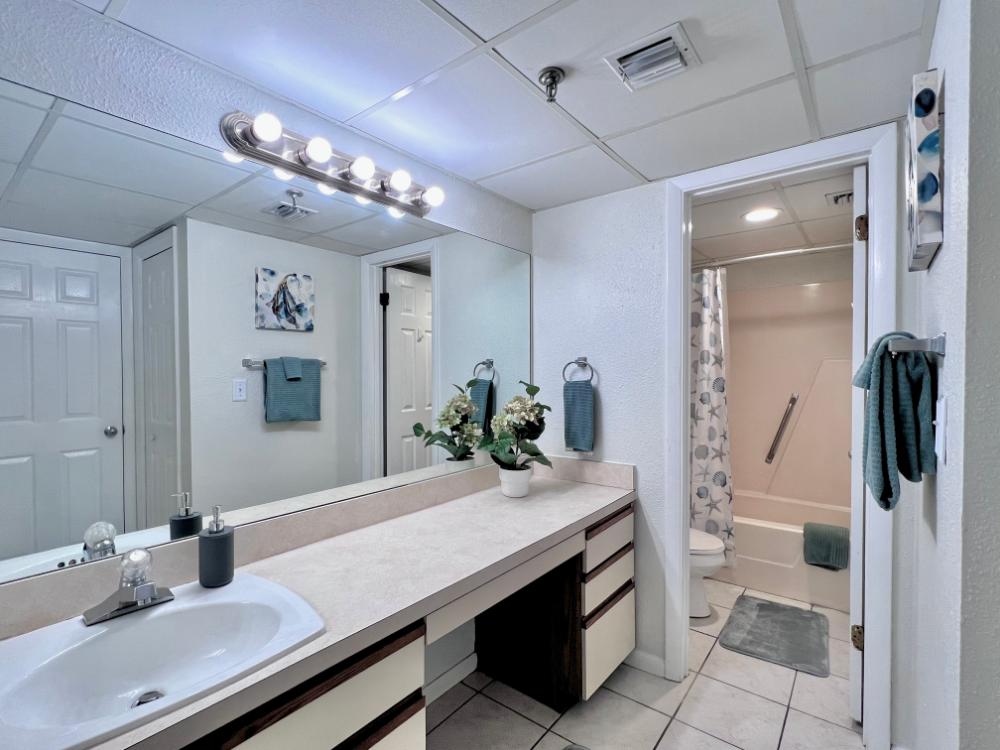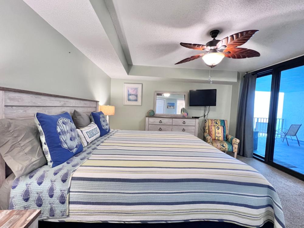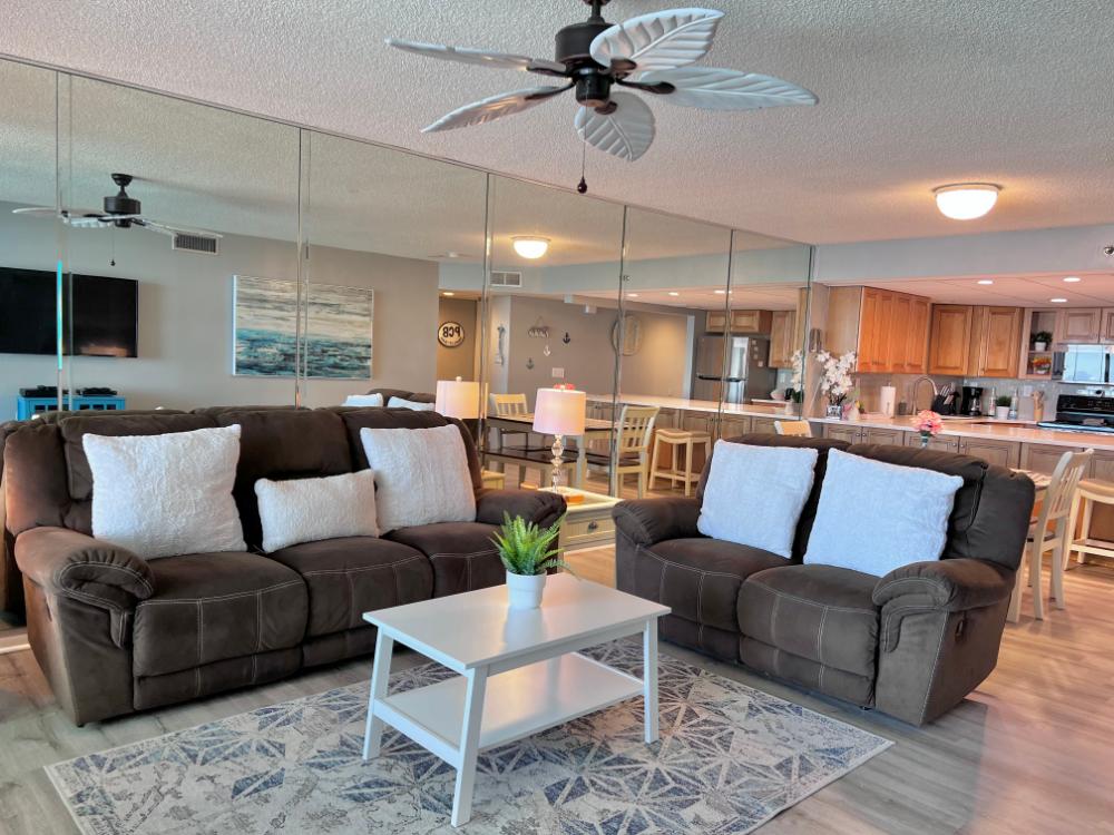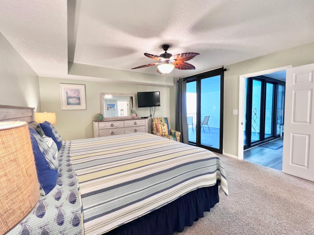 You will enjoy high quality furnishings and bedding throughout in this 1440 sq. ft. two bedroom and two bath condo. One of the most exciting perks of this condo is the large covered balcony. If truly feels like an extension of the interior, TV included! All new appliances, flooring, paint, and furnishings are your to enjoy! All bedrooms and the living room offer flat screen TV's. We "stream" our TV services. Netflix, YouTube TV and many others are available allowing you to watch endless movies, news channels and the local channels. The kitchen is stocked with every gadget you'll need to prepare a gourmet meal – all you need to do is decide if you want to eat inside at the dining table or outside on the covered balcony – both have fantastic water views and spectacular sunsets! The master bedroom has a king size bed and the second large bedroom has two queen size beds. In the living room you have available 2 twin size cots allowing you to sleep comfortably 8 people. This unit also comes with FREE BEACH SERVICE!