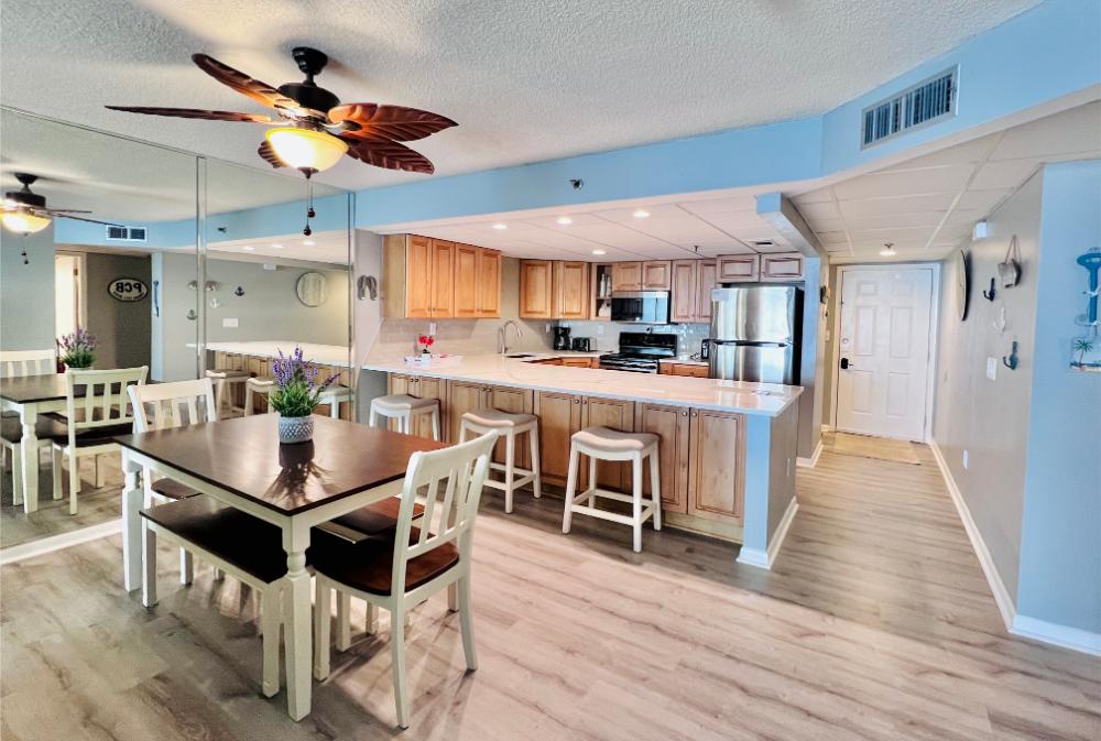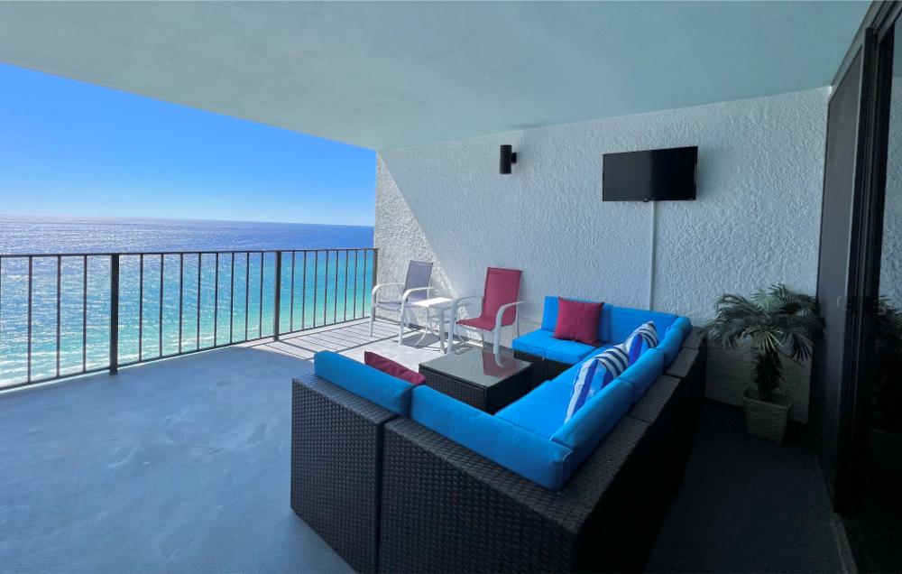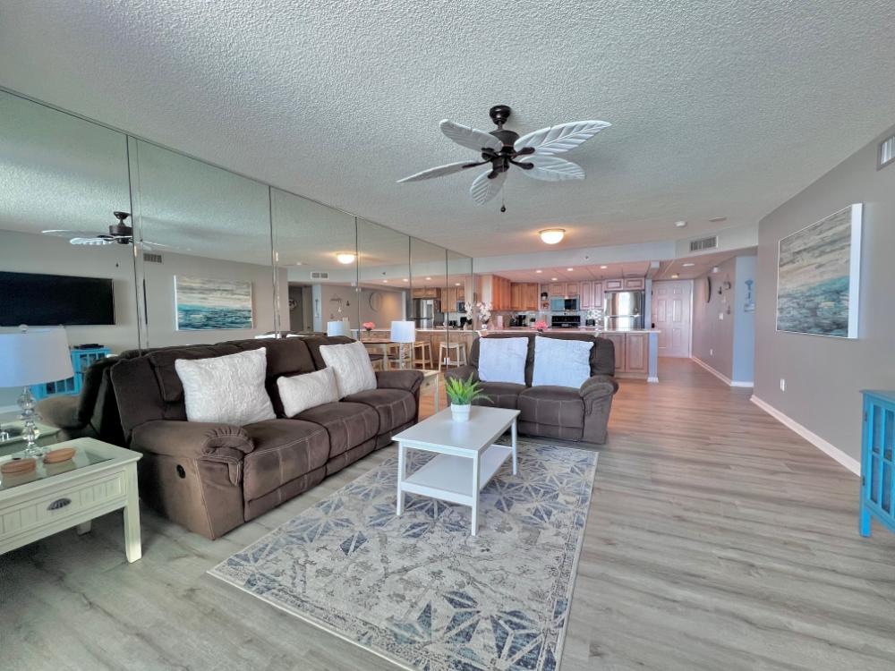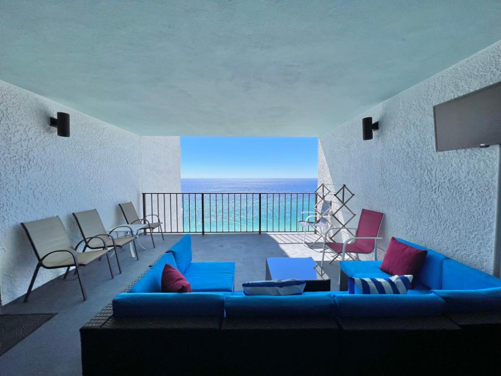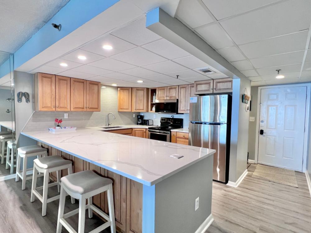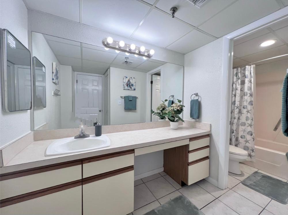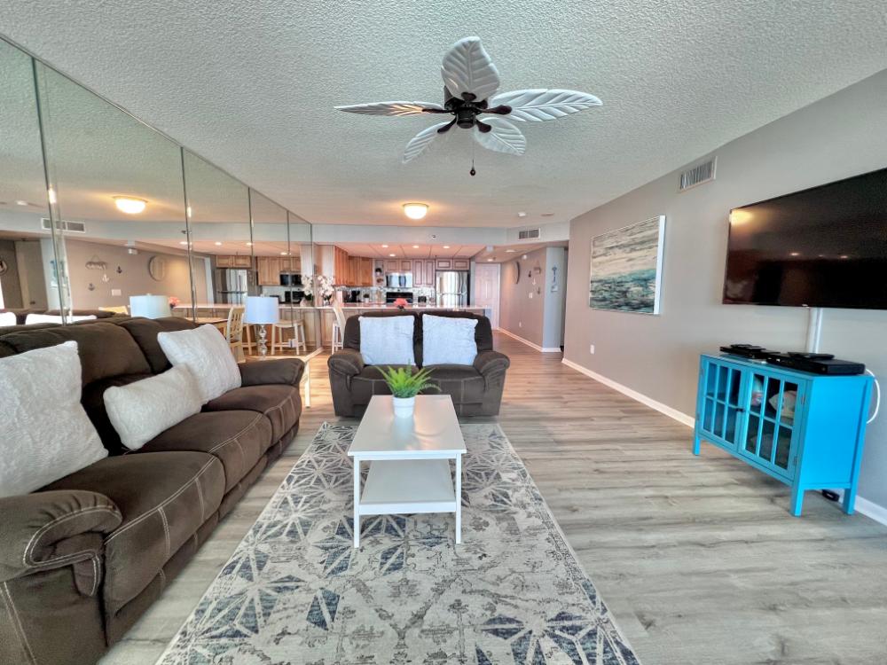 You will enjoy high quality furnishings and bedding throughout in this 1440 sq. ft. two bedroom and two bath condo. One of the most exciting perks of this condo is the large covered balcony. If truly feels like an extension of the interior, TV included! All new appliances, flooring, paint, and furnishings are your to enjoy! All bedrooms and the living room offer flat screen TV's. We "stream" our TV services. Netflix, YouTube TV and many others are available allowing you to watch endless movies, news channels and the local channels. The kitchen is stocked with every gadget you'll need to prepare a gourmet meal – all you need to do is decide if you want to eat inside at the dining table or outside on the covered balcony – both have fantastic water views and spectacular sunsets! The master bedroom has a king size bed and the second large bedroom has two queen size beds. In the living room you have available 2 twin size cots allowing you to sleep comfortably 8 people. This unit also comes with FREE BEACH SERVICE!