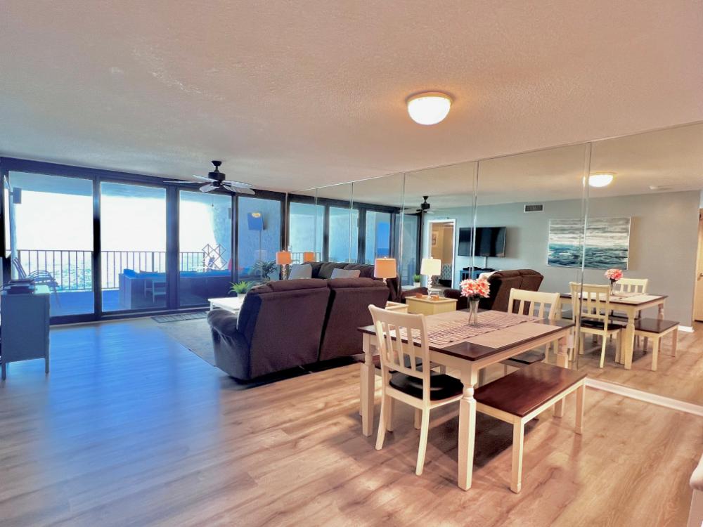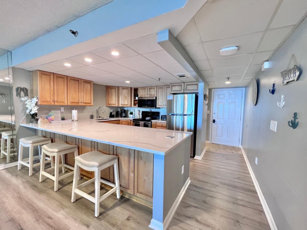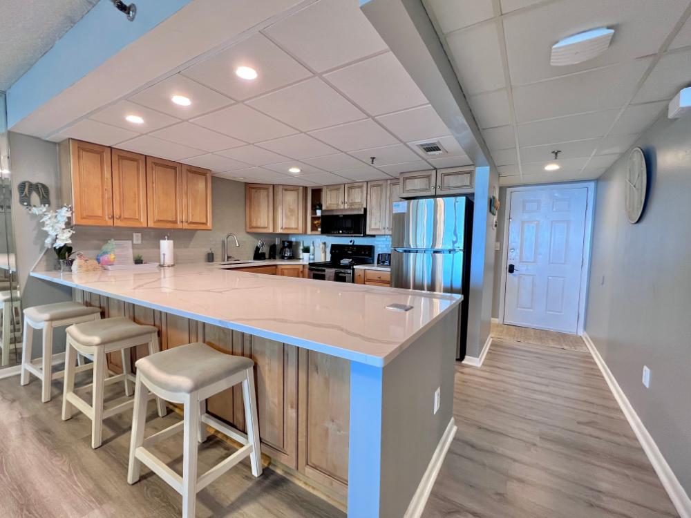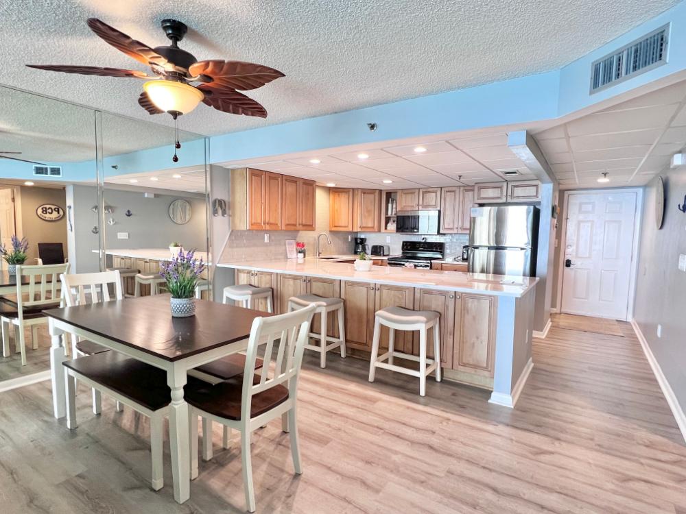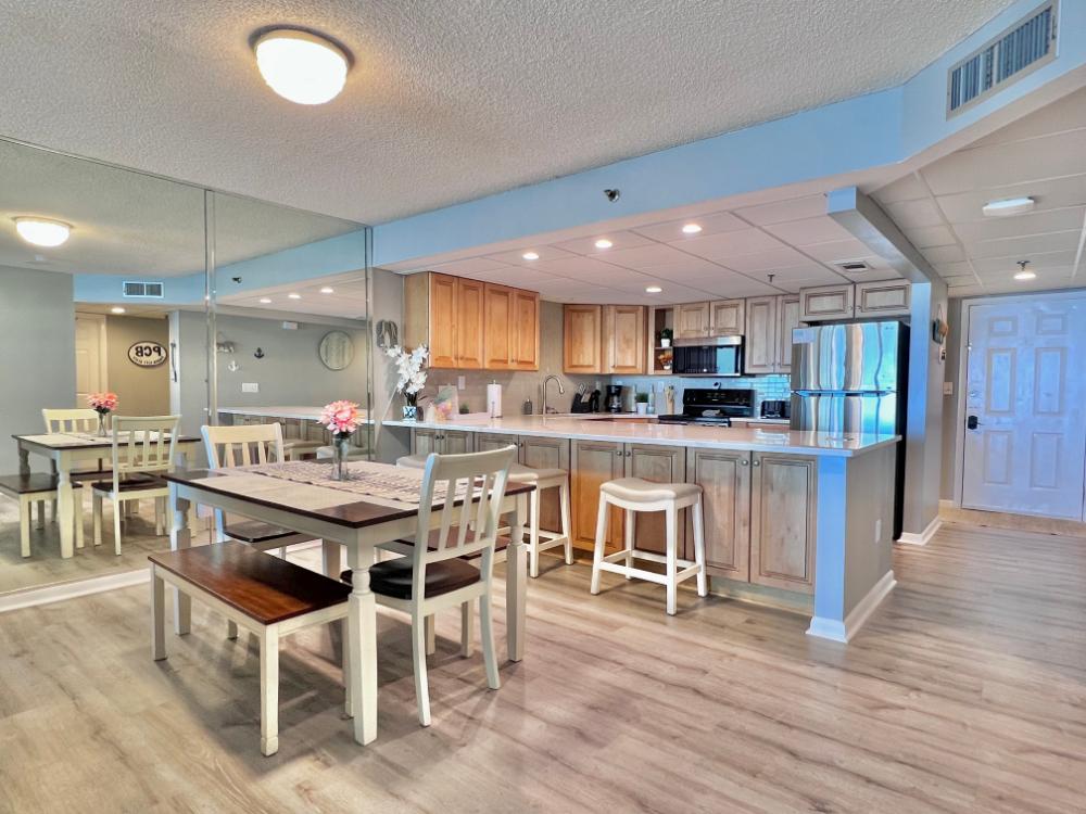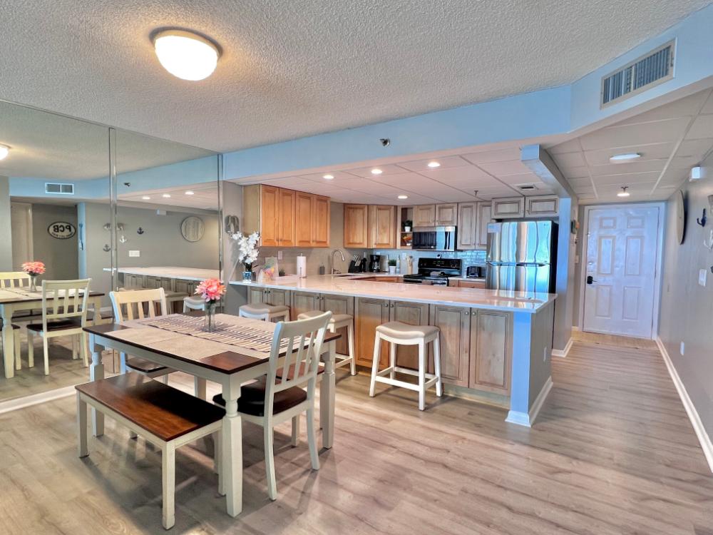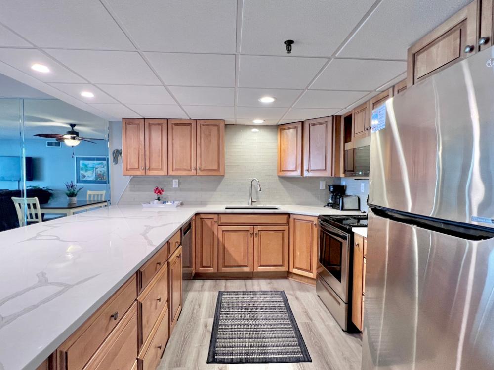 You will enjoy high quality furnishings and bedding throughout in this 1440 sq. ft. two bedroom and two bath condo. One of the most exciting perks of this condo is the large covered balcony. If truly feels like an extension of the interior, TV included! All new appliances, flooring, paint, and furnishings are your to enjoy! All bedrooms and the living room offer flat screen TV's. We "stream" our TV services. Netflix, YouTube TV and many others are available allowing you to watch endless movies, news channels and the local channels. The kitchen is stocked with every gadget you'll need to prepare a gourmet meal – all you need to do is decide if you want to eat inside at the dining table or outside on the covered balcony – both have fantastic water views and spectacular sunsets! The master bedroom has a king size bed and the second large bedroom has two queen size beds. In the living room you have available 2 twin size cots allowing you to sleep comfortably 8 people. This unit also comes with FREE BEACH SERVICE!