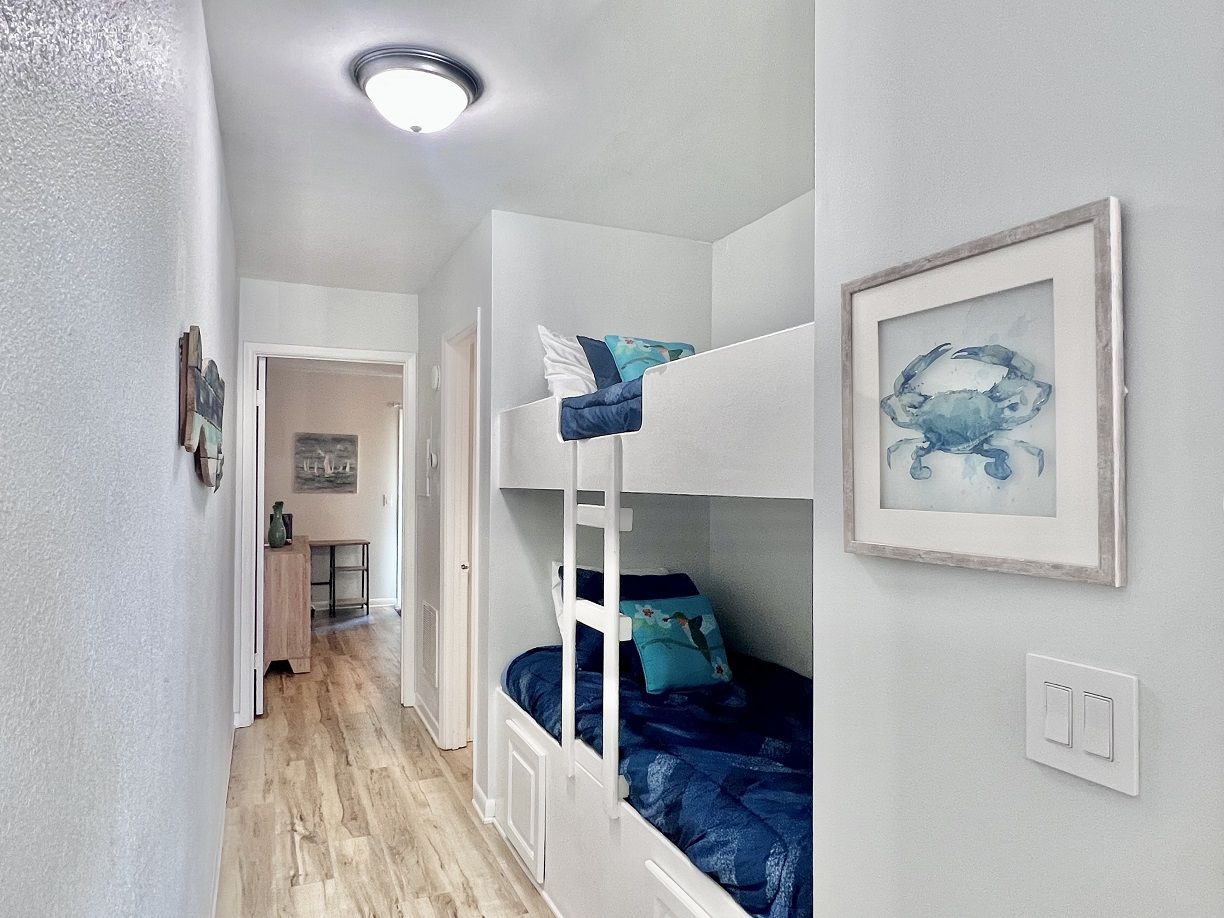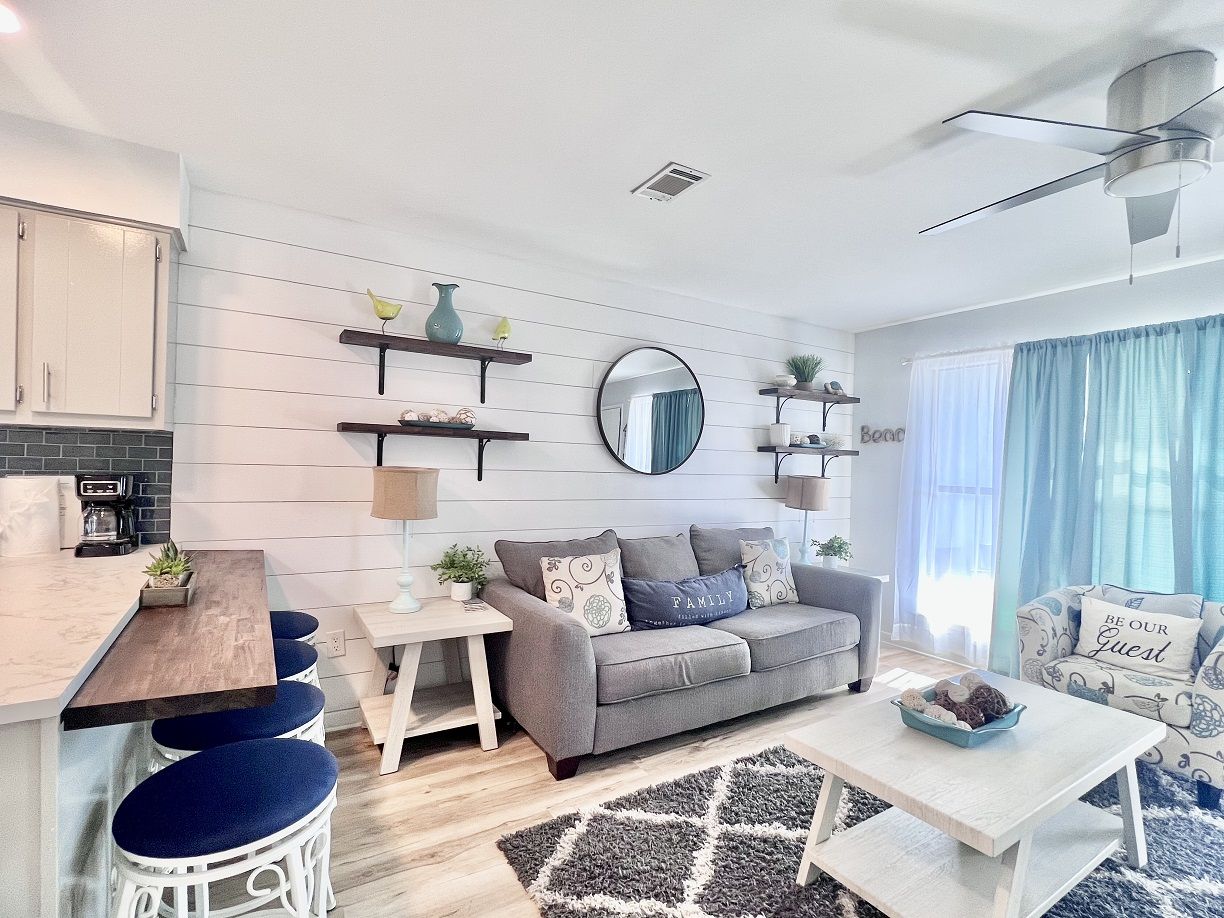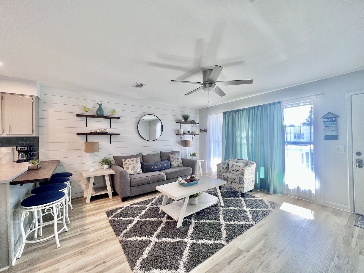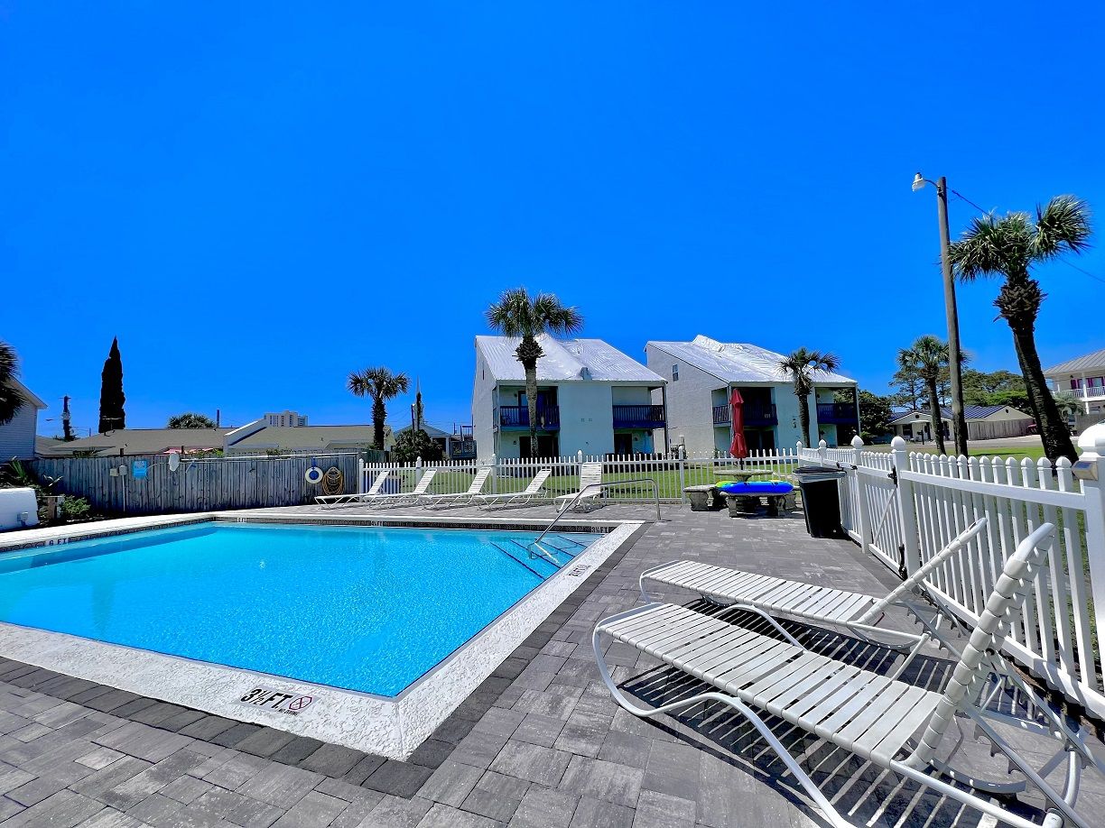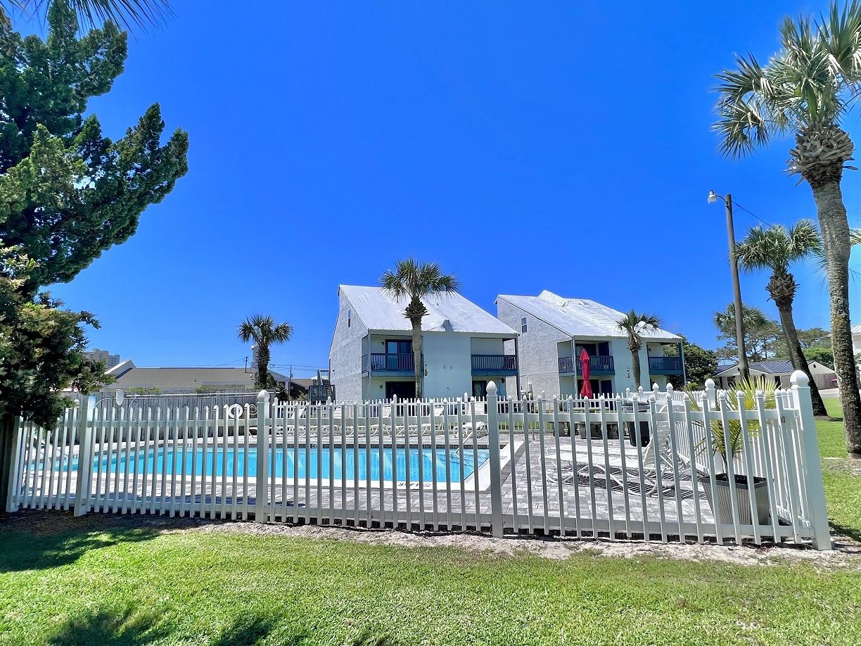 This one bedroom condo easily and comfortably sleeps six while providing plenty of space for total relaxation, coastal vibes, and great community. The bedroom sleeps 2, there are 2 twin bunks in an alcove, and a queen sleeper sofa. There is a large green-space for a fun game of corn hole or to let the kids be kids. All within walking distance. Sunshine Villa is only a mile from Pier Park! You can't go wrong choosing Sunshine Villa for your vacation destination!