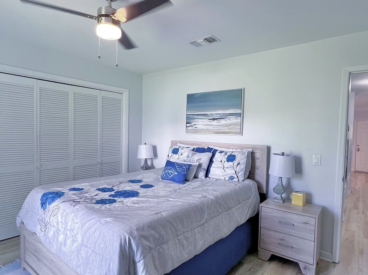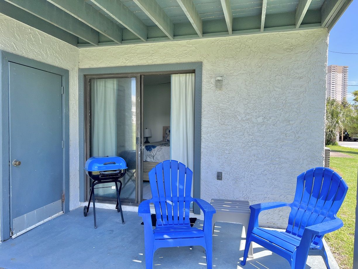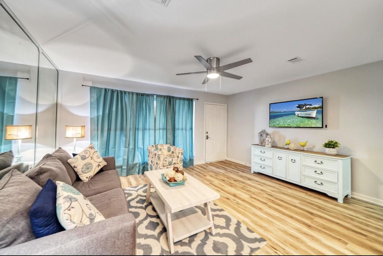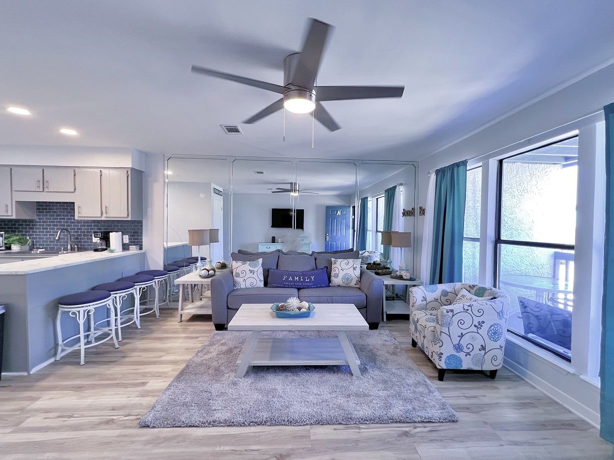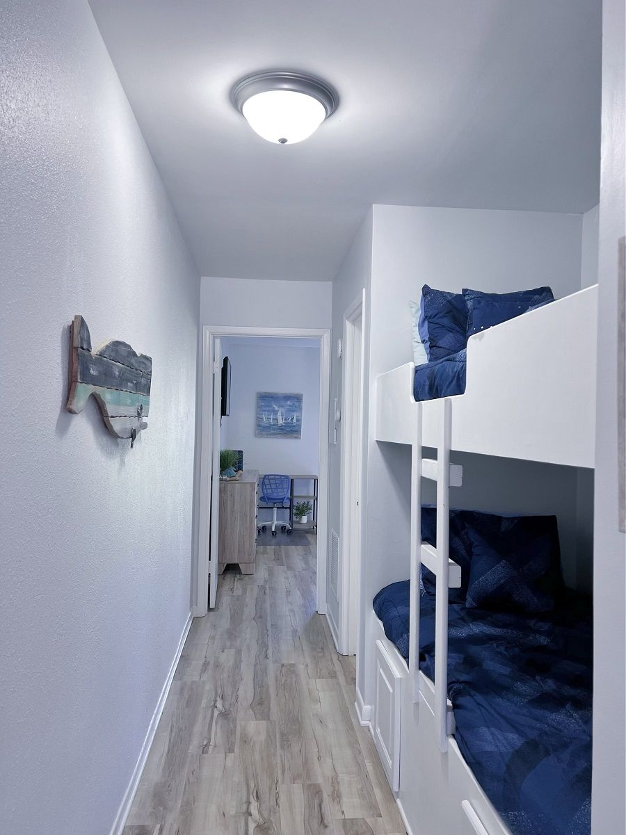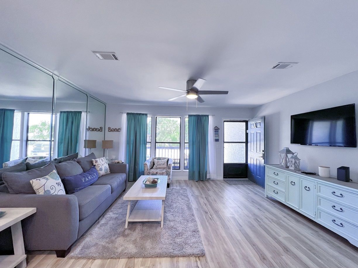 This one bedroom condo easily and comfortably sleeps six while providing plenty of space for total relaxation, coastal vibes, and great community. The bedroom sleeps 2, there are 2 twin bunks in an alcove, and a queen sleeper sofa. There is a large green-space for a fun game of corn hole or to let the kids be kids. All within walking distance. Sunshine Villa is only a mile from Pier Park! You can't go wrong choosing Sunshine Villa for your vacation destination!