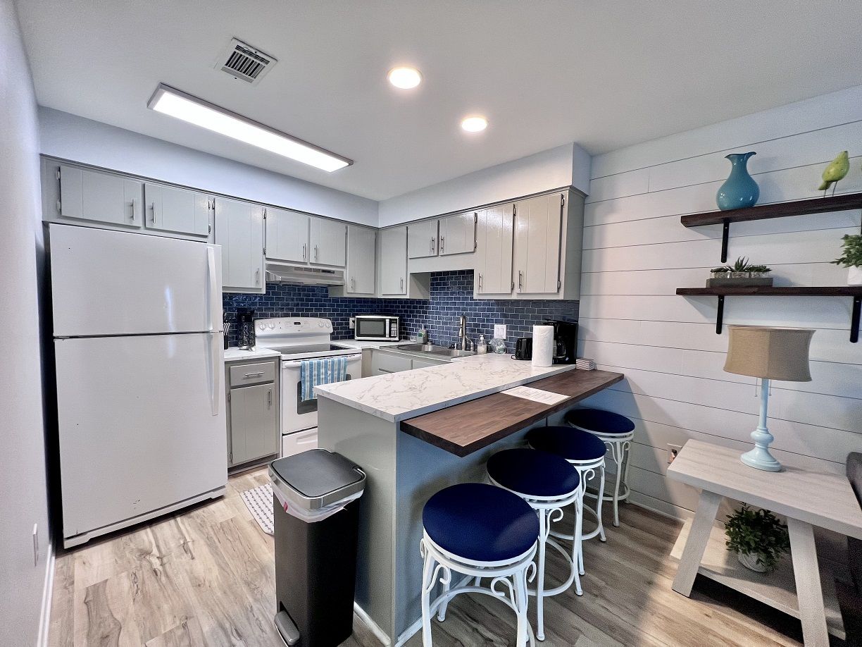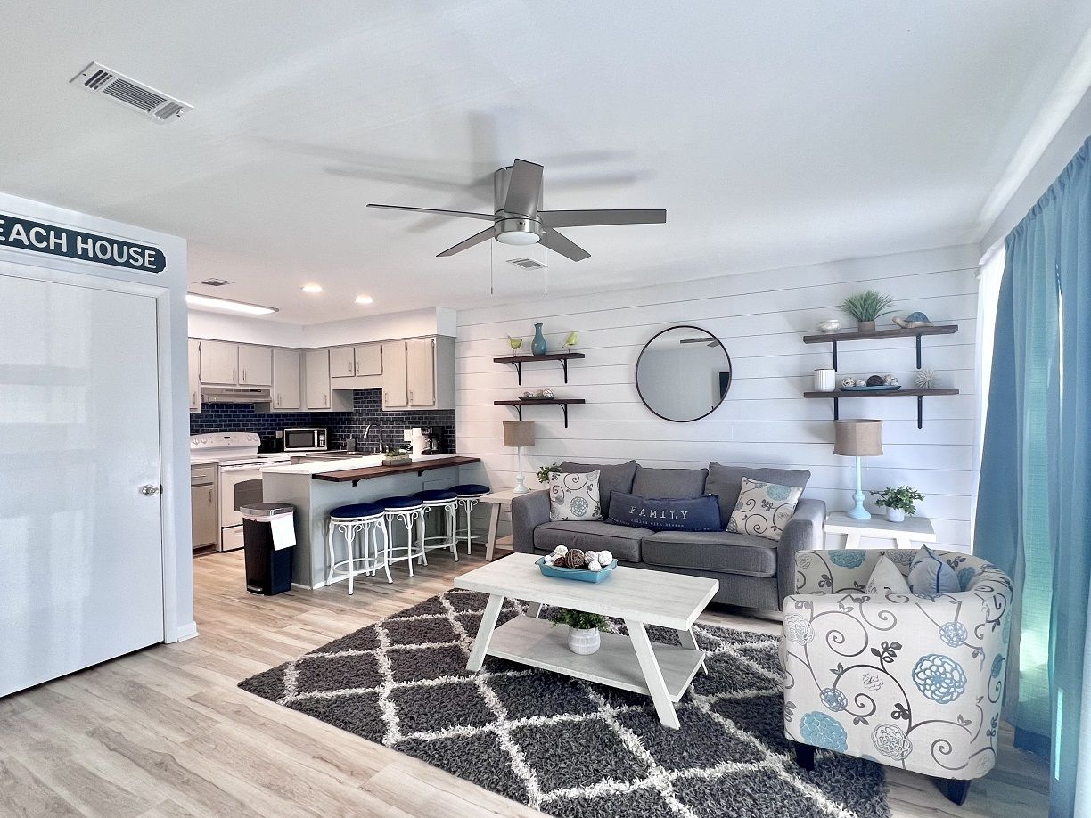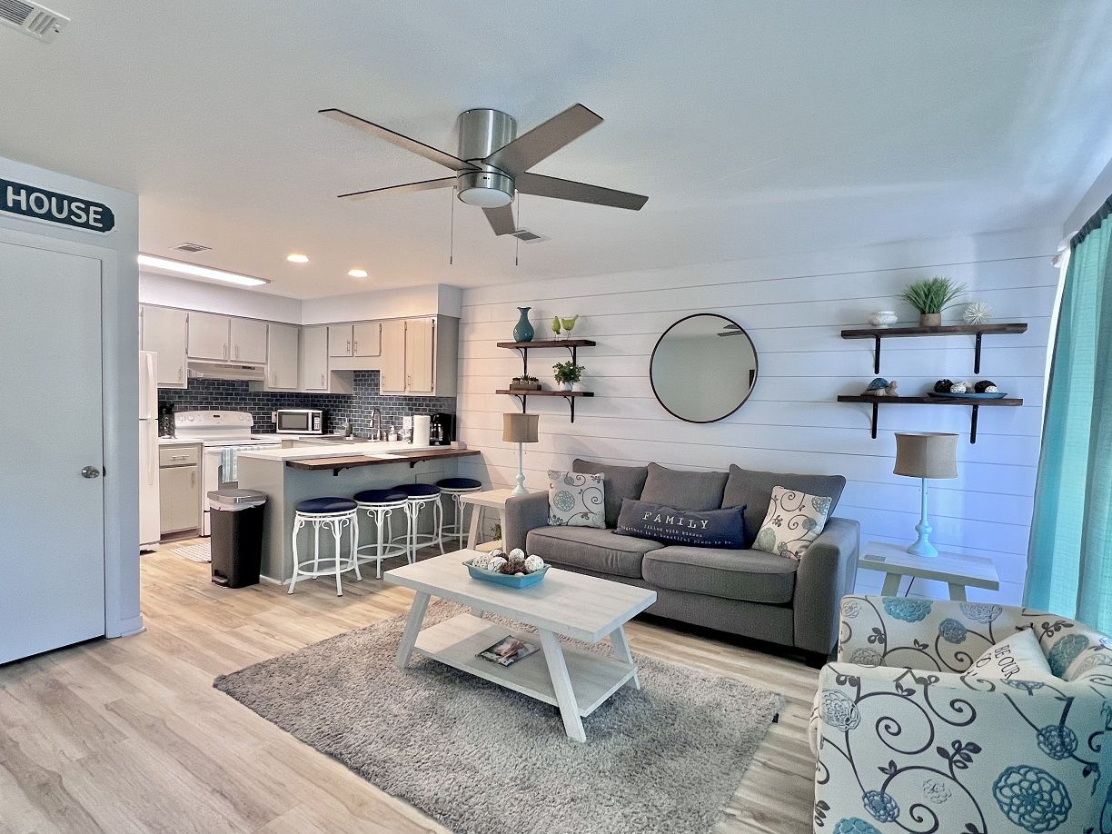 This cozy coastal retreat has everything you need to kick back and relax while just a 3 minute walk to the nearest beach access next to the Barefoot Tiki Bar so you'll have access to a full bar for refreshments while you lounge in the sun and watch the waves! There's also a green-space with a gazebo, great for picnics, and also a chair rental and water sports rental hut. Go play all dayand come back to Sunshine Villa to prepare a homecooked meal for the family and friends in your fully stocked kitchen and discuss the day's adventures and plan tomorrow's!