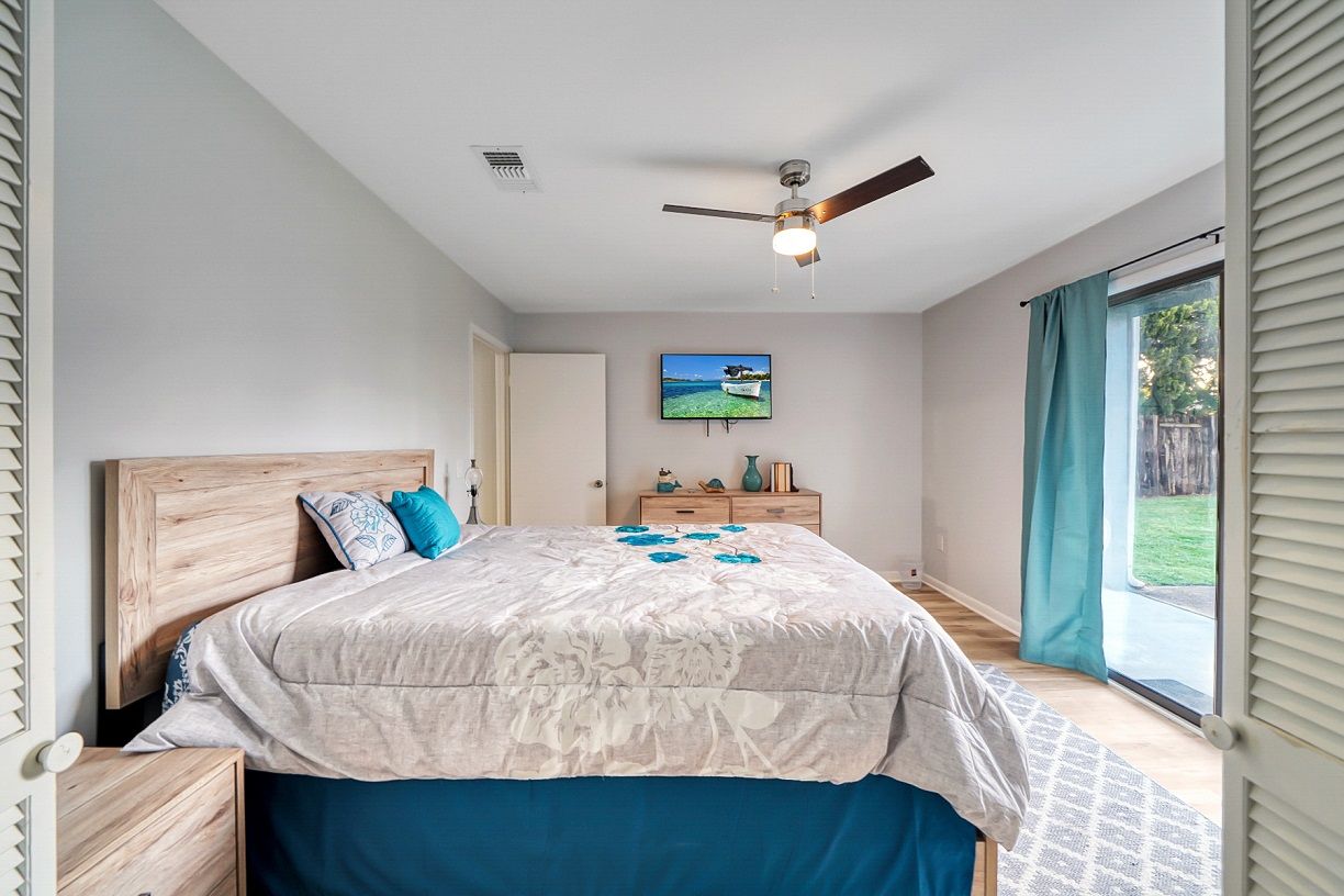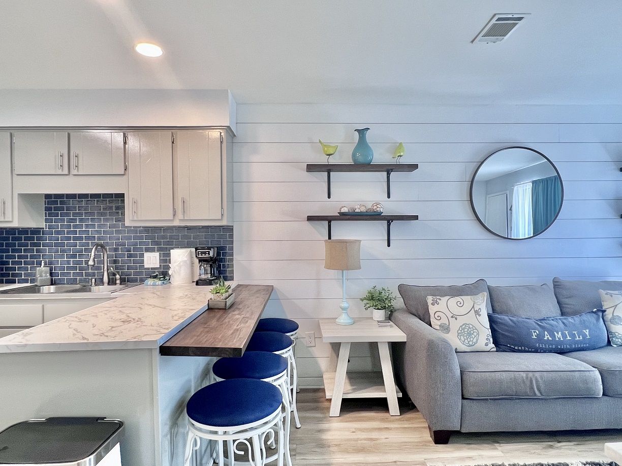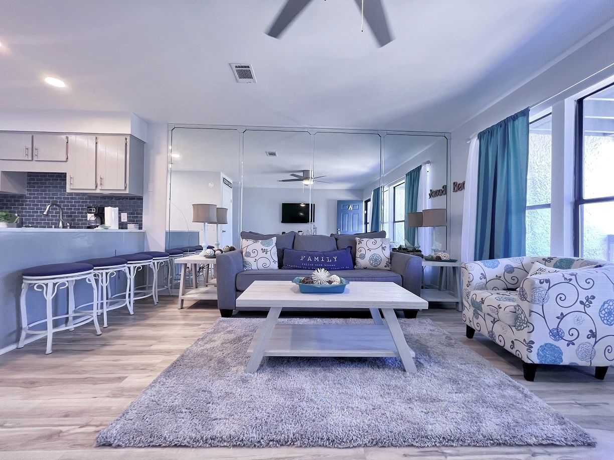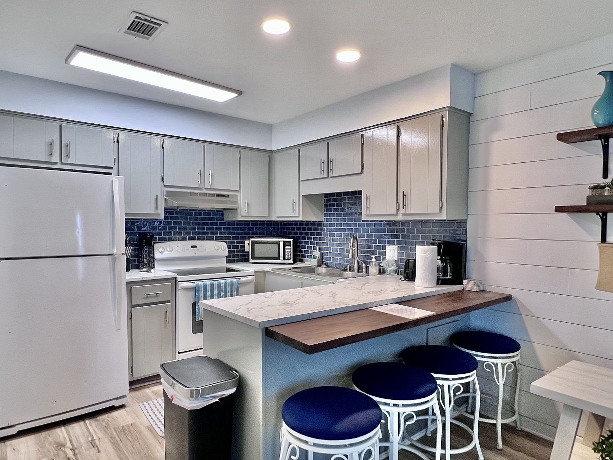 This cozy coastal retreat has everything you need to kick back and relax while just a 3 minute walk to the nearest beach access next to the Barefoot Tiki Bar so you'll have access to a full bar for refreshments while you lounge in the sun and watch the waves! There's also a green-space with a gazebo, great for picnics, and also a chair rental and water sports rental hut. Go play all dayand come back to Sunshine Villa to prepare a homecooked meal for the family and friends in your fully stocked kitchen and discuss the day's adventures and plan tomorrow's!