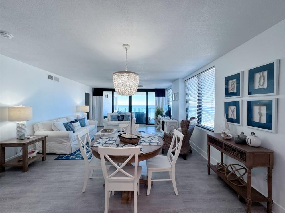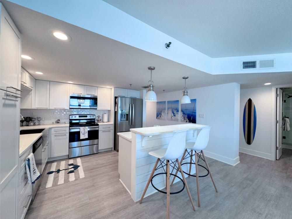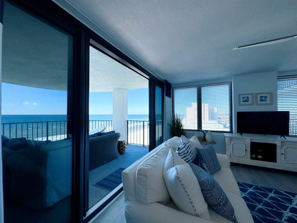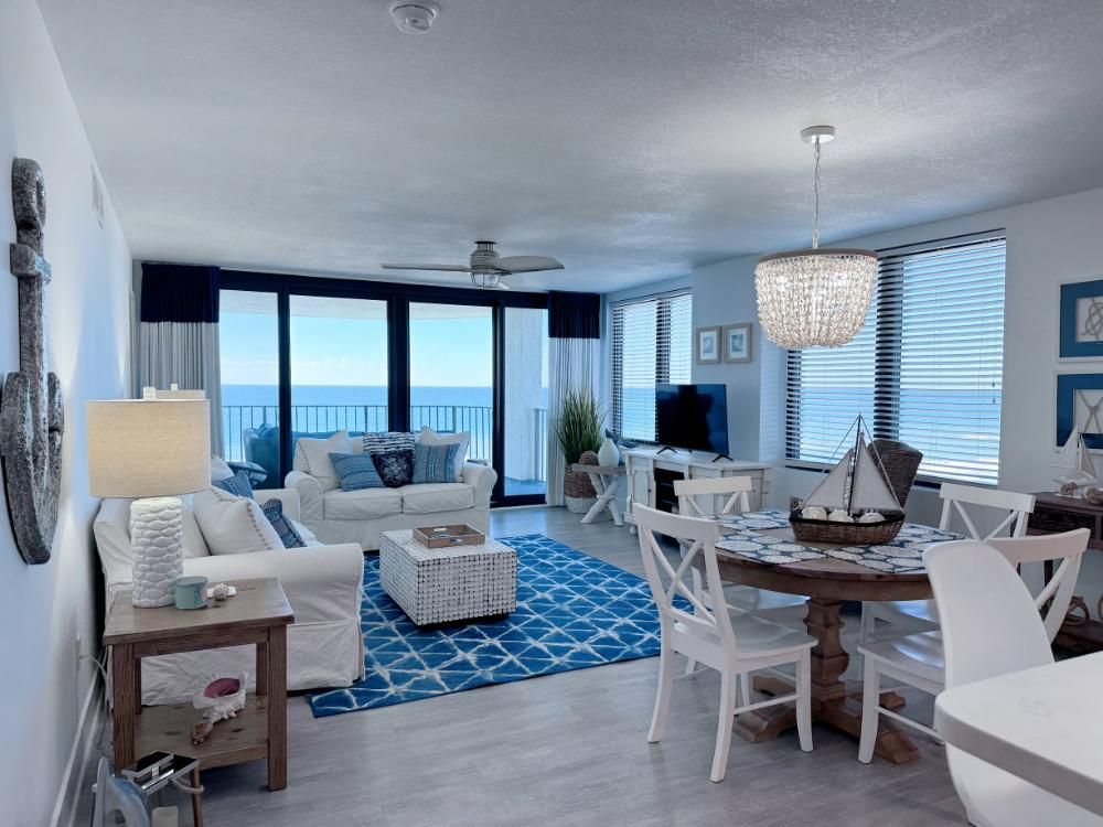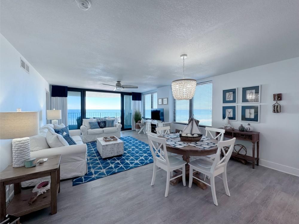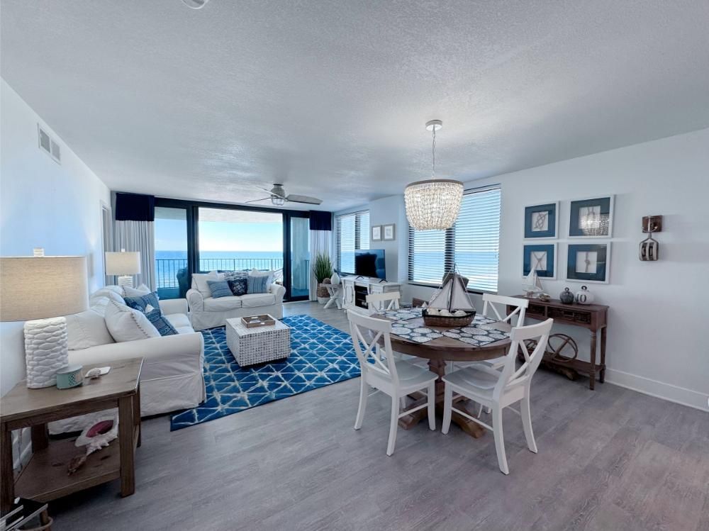 'It's a Shore Thing' that this is one of the most pristine beachfront condos in the area and offers panoramic views of emerald green waters. The defining presence of impossibly soft sugar white sand on Florida's Emerald Coast is a sensory experience we would love to share with you and your family. Our remodeling goal was to provide perfectly balanced style and comfort to this open floor plan and ensure a vacation stay you will not soon forget! Enjoy beach views from the kitchen, dining area, master suite, and living area. Access to the covered balcony is just off the living area and there is also direct access to the balcony from the master suite. Indoors and on the balcony you will find comfortable seating and a stunning view of the pool deck, beach, and the Gulf and the perfect setting to enjoy the spectacular sunset.... Best seat in the house for sun sets! This is truly a condo set above the rest and every inch of the condo has been renovated beautifully. As of today this unit has never been rented and was designed for comfortable living and no expense was spared! Come be one of our first guests at this opulent 2 bed two bath condo featuring a luxurious king bed in the master suite and two queen beds in the second bedroom. There is also a sleeper sofa in the living area, comfortably sleeping 6 guests. Both bathrooms feature beautiful tiled walk in showers we know you will love! The covered balcony is very large and just a great place to enjoy your day with some of the best views in Florida. Come, be our guest.