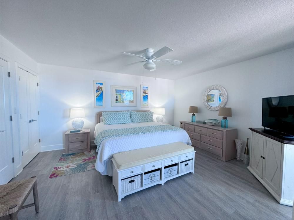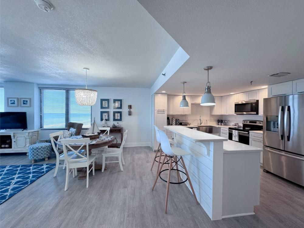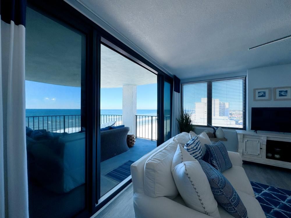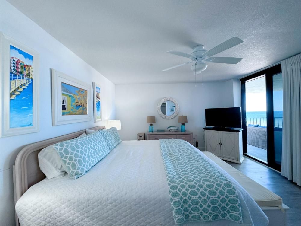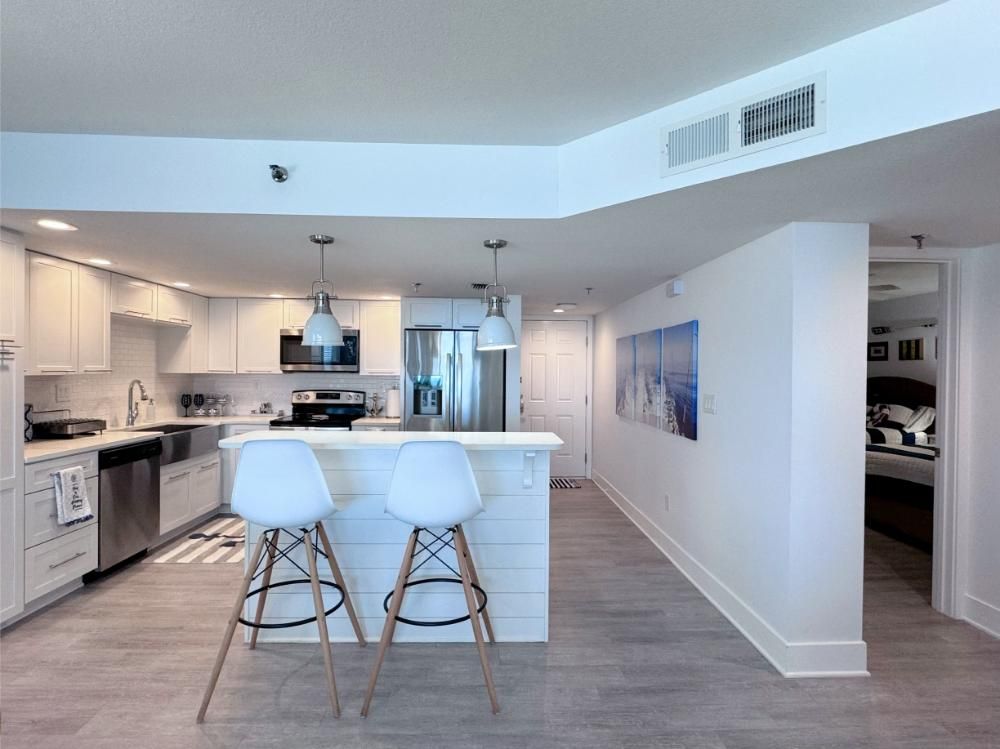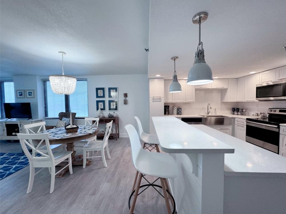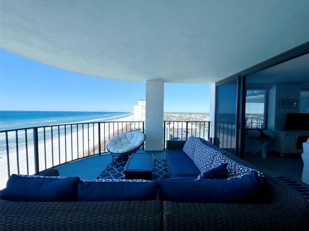 'It's a Shore Thing' that this is one of the most pristine beachfront condos in the area and offers panoramic views of emerald green waters. The defining presence of impossibly soft sugar white sand on Florida's Emerald Coast is a sensory experience we would love to share with you and your family. Our remodeling goal was to provide perfectly balanced style and comfort to this open floor plan and ensure a vacation stay you will not soon forget! Enjoy beach views from the kitchen, dining area, master suite, and living area. Access to the covered balcony is just off the living area and there is also direct access to the balcony from the master suite. Indoors and on the balcony you will find comfortable seating and a stunning view of the pool deck, beach, and the Gulf and the perfect setting to enjoy the spectacular sunset.... Best seat in the house for sun sets! This is truly a condo set above the rest and every inch of the condo has been renovated beautifully. As of today this unit has never been rented and was designed for comfortable living and no expense was spared! Come be one of our first guests at this opulent 2 bed two bath condo featuring a luxurious king bed in the master suite and two queen beds in the second bedroom. There is also a sleeper sofa in the living area, comfortably sleeping 6 guests. Both bathrooms feature beautiful tiled walk in showers we know you will love! The covered balcony is very large and just a great place to enjoy your day with some of the best views in Florida. Come, be our guest.