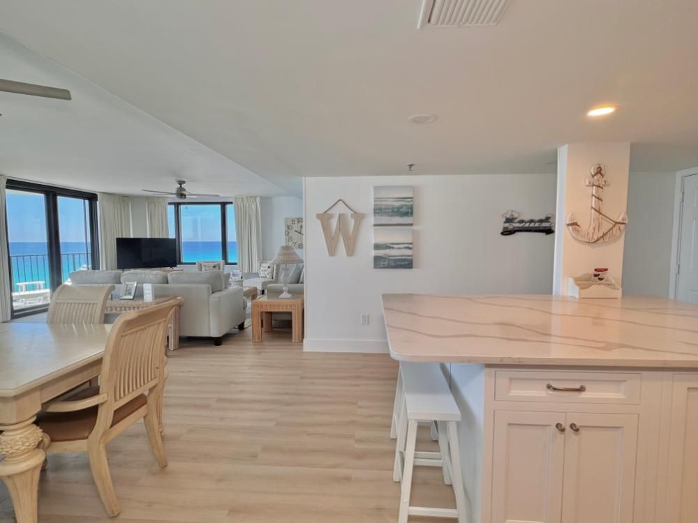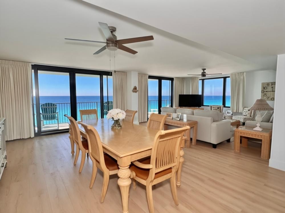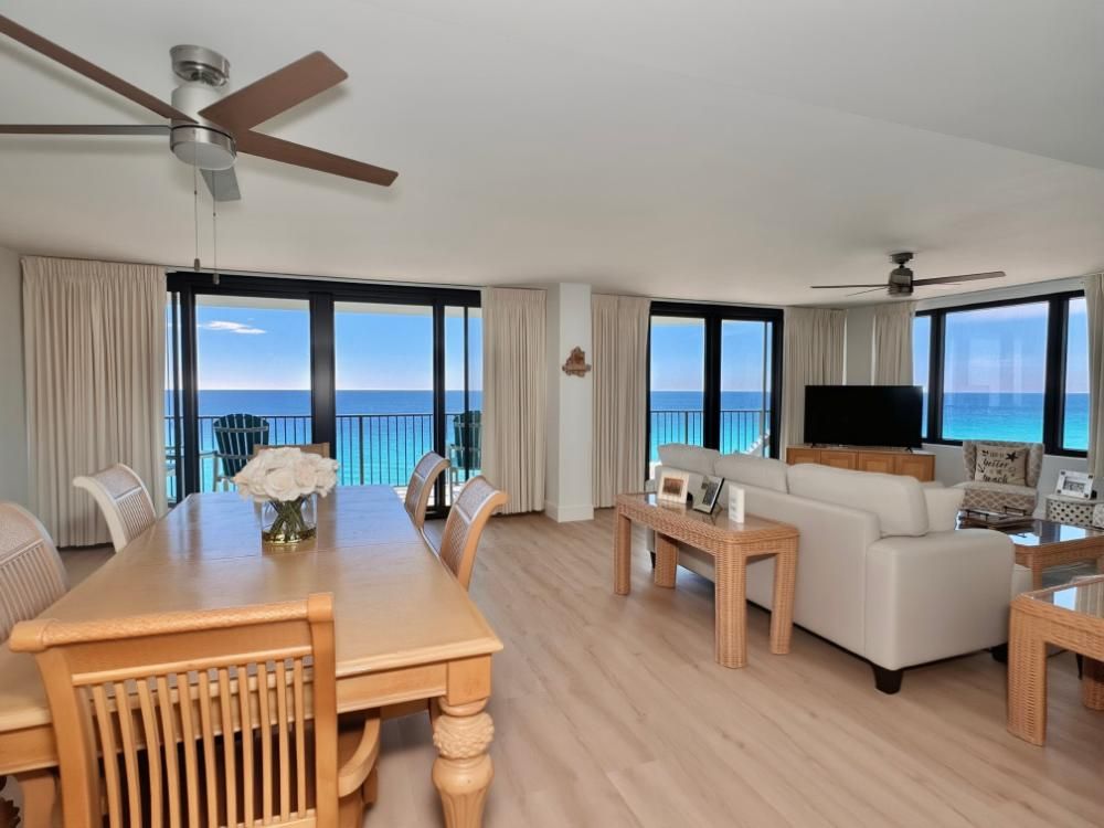 This Condominium sits on a famous 27 mile stretch of sugar white sand where ribbons of emerald water lap the shoreline continually. Panama City Beach is consistently voted one of the most beautiful beaches in the world! Along with an amazing beach, our destination offers conservation parks, award-winning restaurants and spectacular shopping. Something for the entire family. Come and enjoy! At Watercrest, Condo 1208, you will experience a well maintained property from the entry portico with a beautiful water feature to the pool complex with a large pool, kiddie pool area, hot tub, and tiki bar. Upon entering the condo you will be greeted with a breathtaking 180 degree view of the Gulf! This condo is beautifully and comfortably decorated and sleeps 8. The balcony is spectacular and affords ample space to listen to the ocean as you dine or enjoy your morning coffee. Sunsets over the Gulf from this vantage point are nothing less than spectacular!