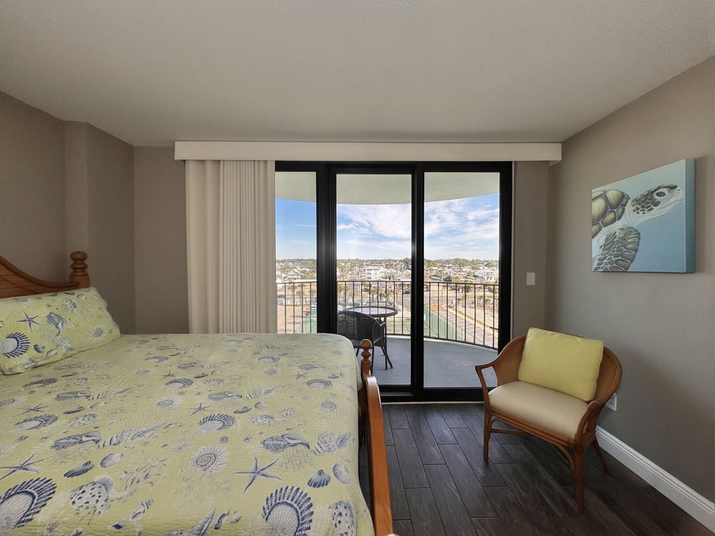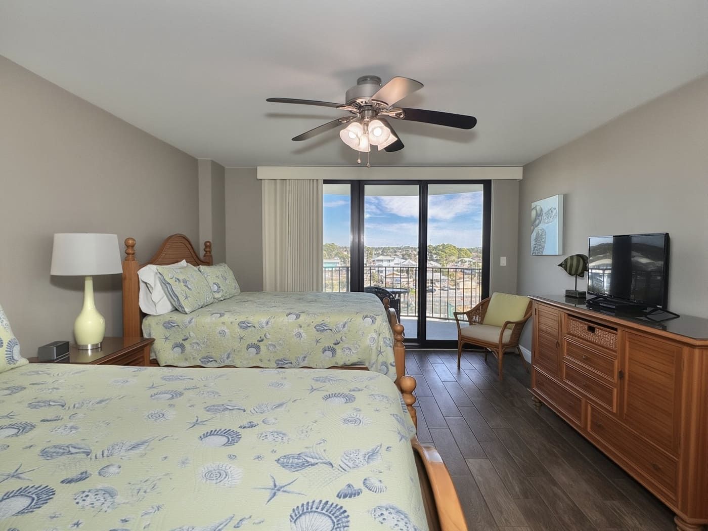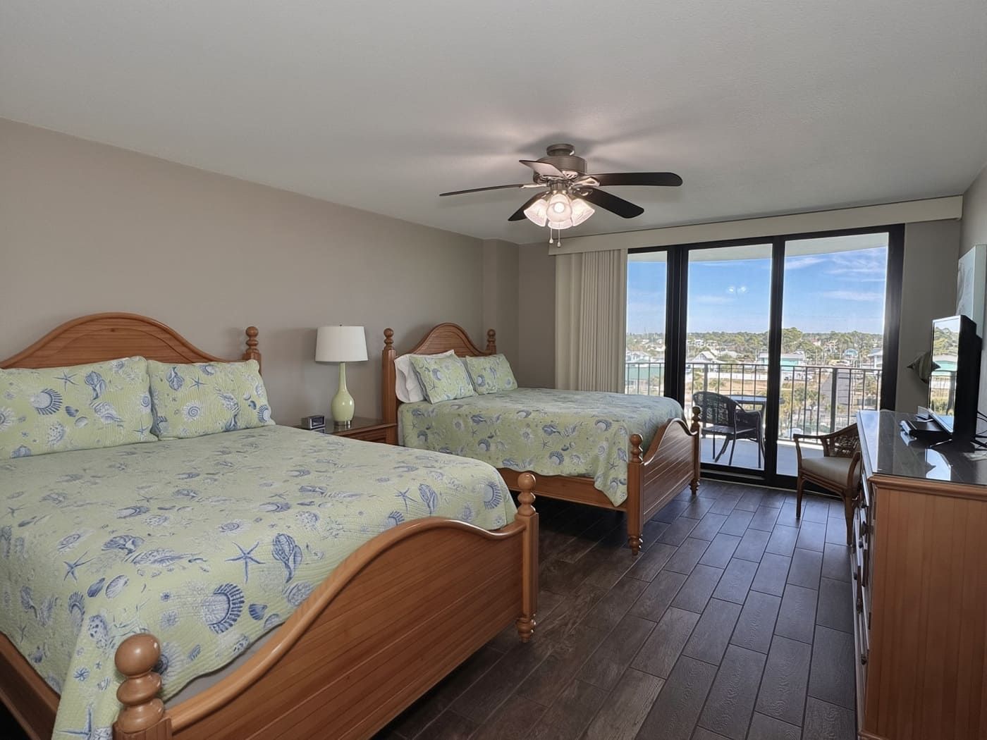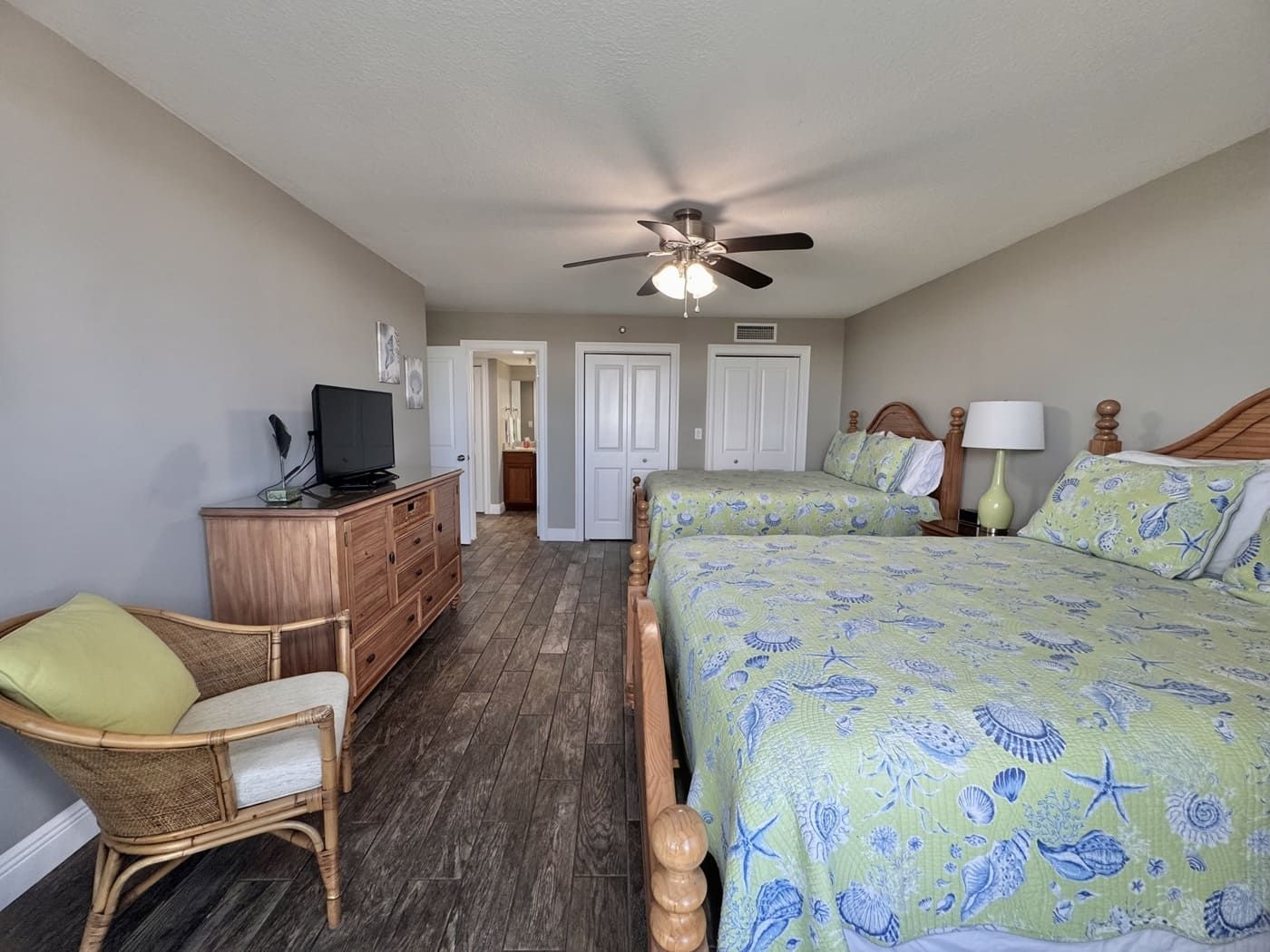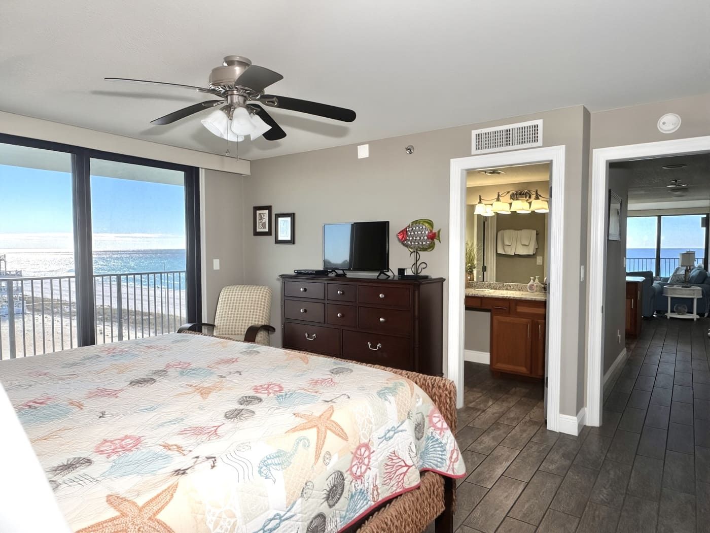 The master bedroom has a king-size bed with a private bath and also shares the wrap around balcony. The guest room has two queen-size beds with a private balcony overlooking the shuffleboard and tennis courts with a large adjoining bath. The kitchen is fully equipped and furnished with cherry cabinets.