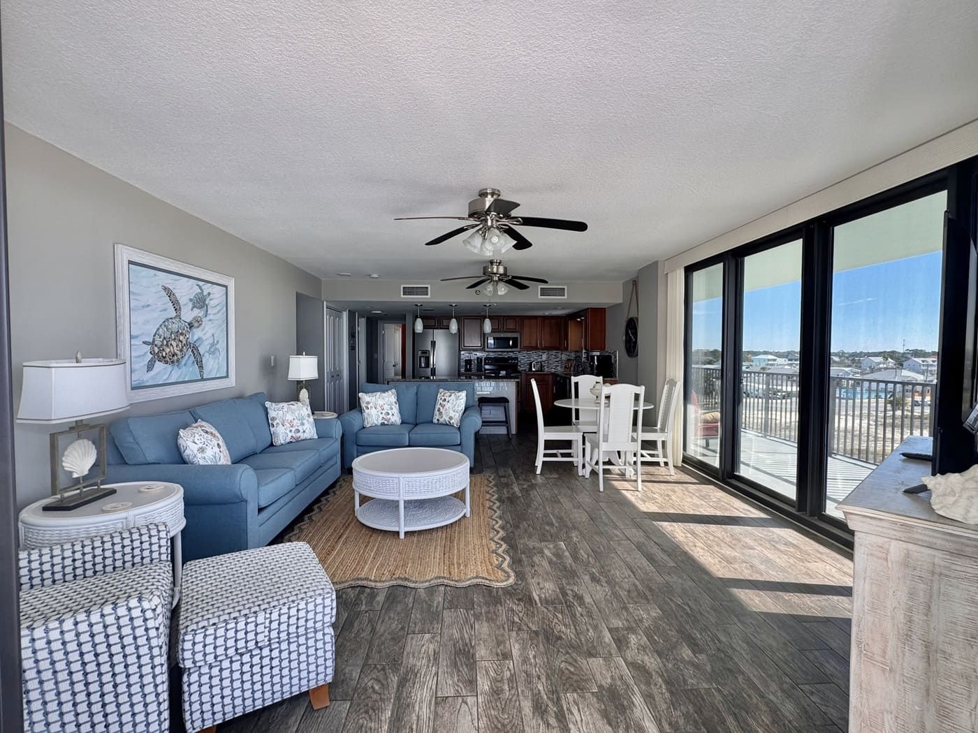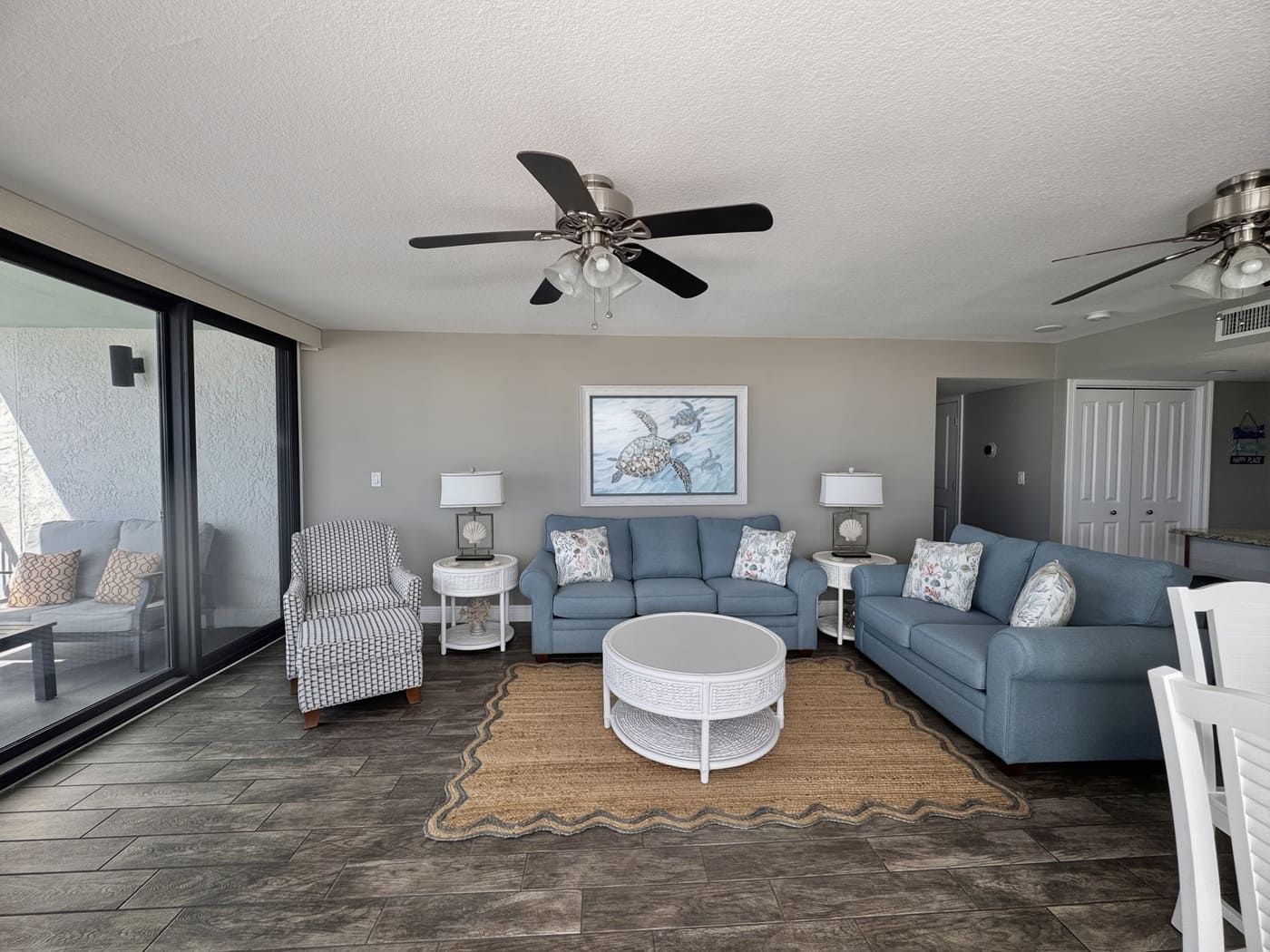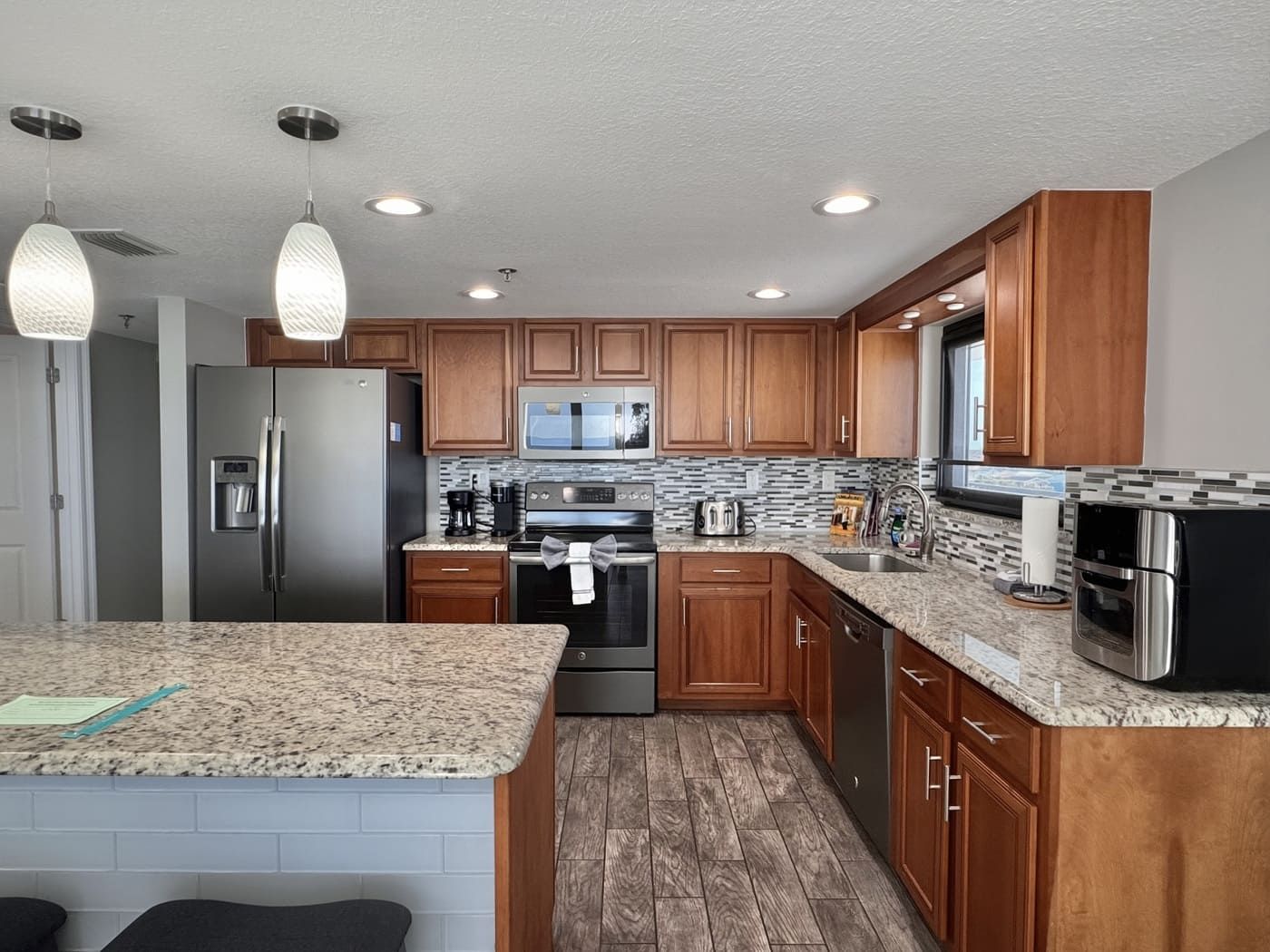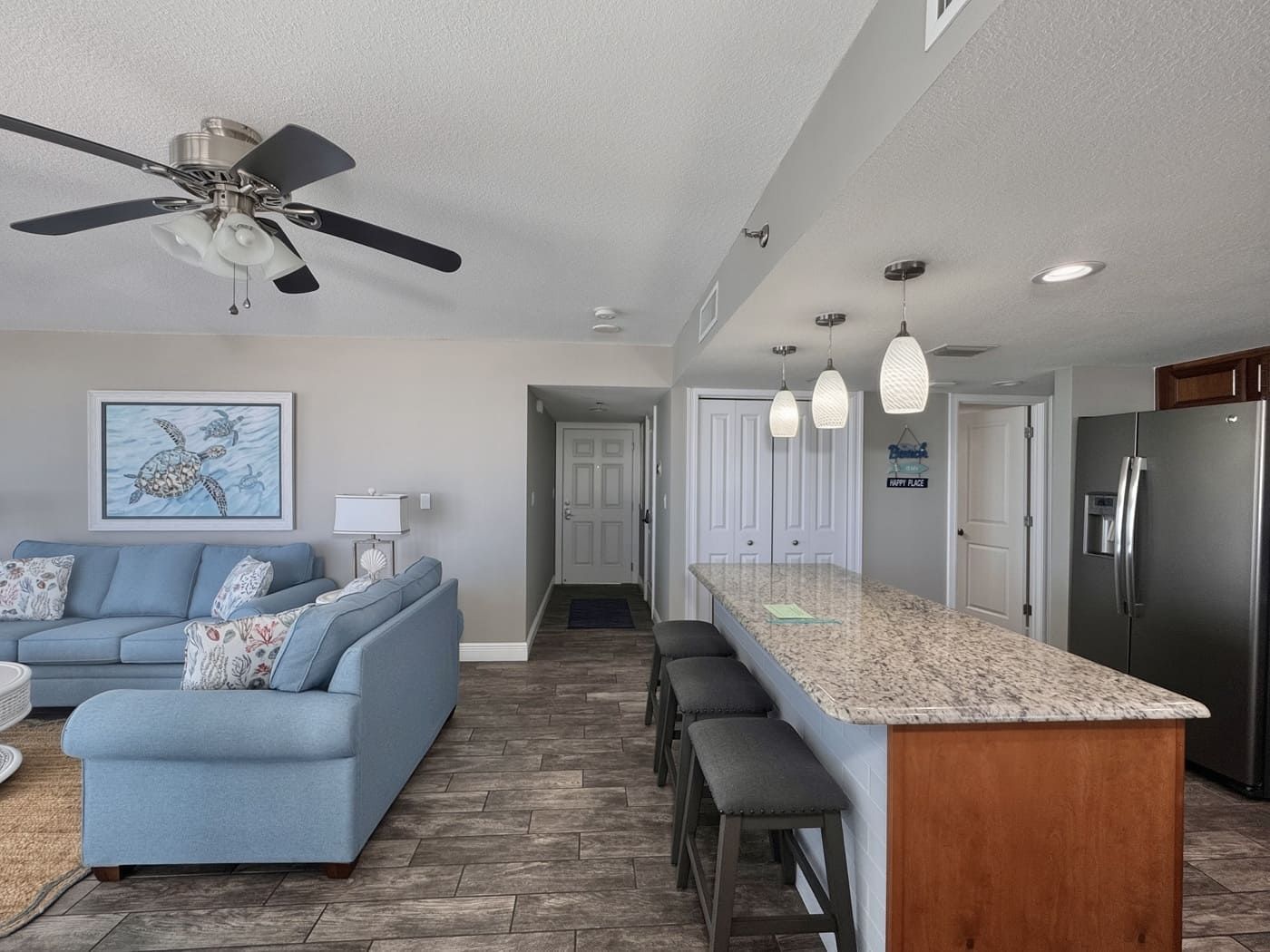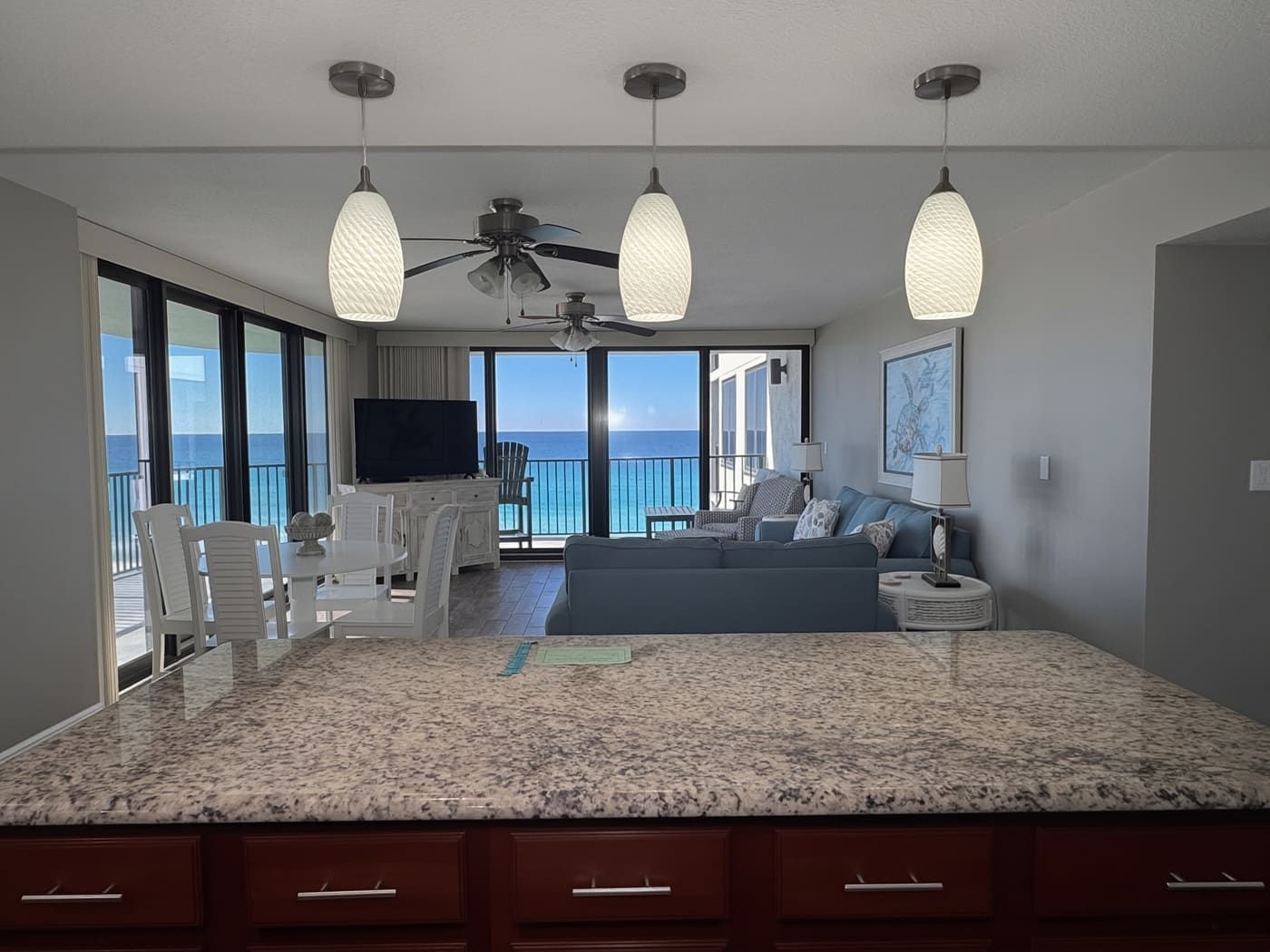 Unit comes with granite countertops in kitchen, master and guest bathrooms, new wood look tile throughout, window treatments throughout, walk-in tiled showers in both bathrooms. Flat screen TV's in living room and both bedrooms. All new patio doors installed November 2019.