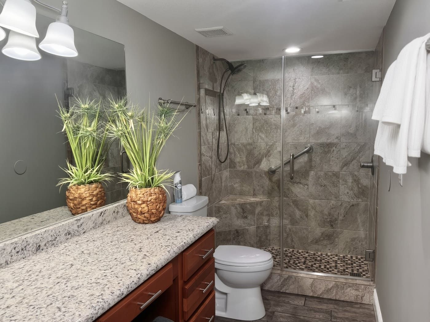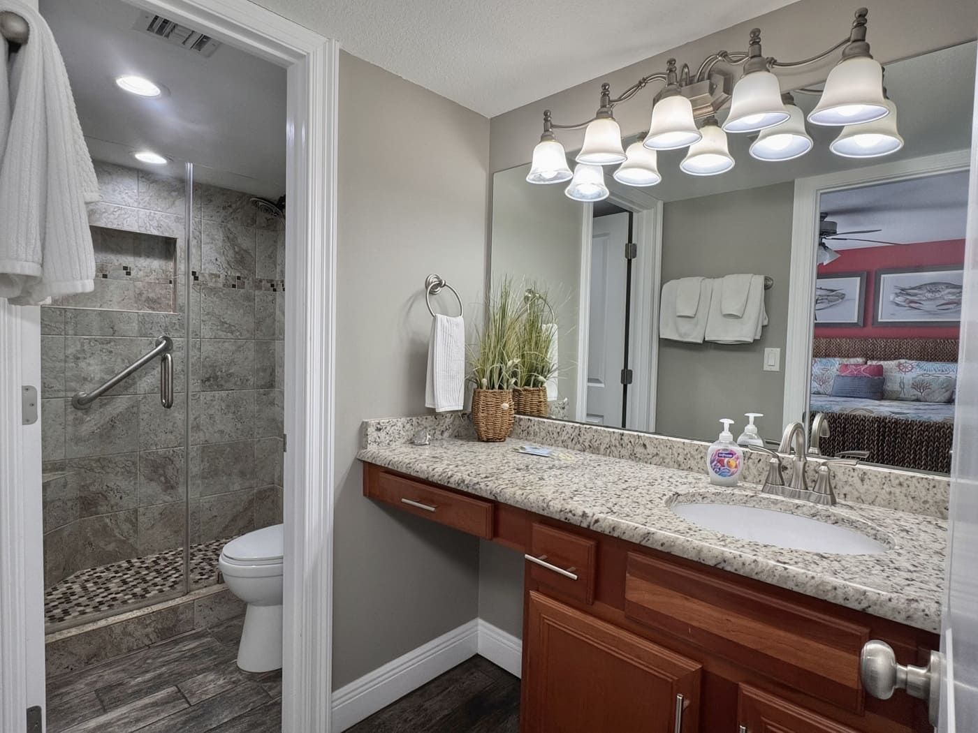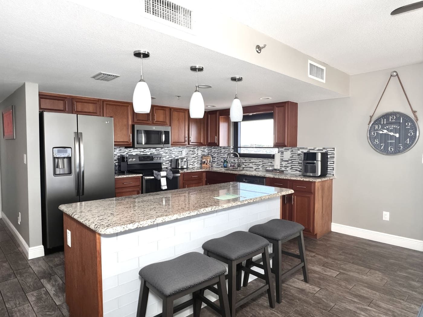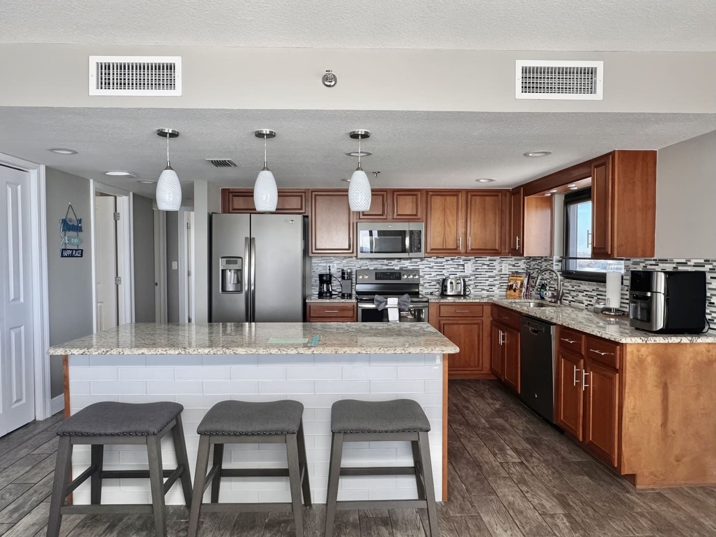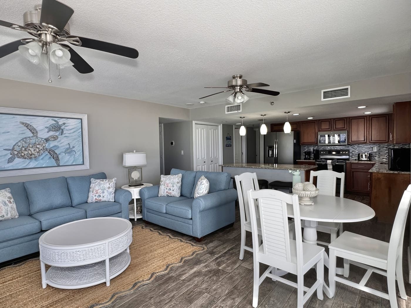 Unit comes with granite countertops in kitchen, master and guest bathrooms, new wood look tile throughout, window treatments throughout, walk-in tiled showers in both bathrooms. Flat screen TV's in living room and both bedrooms. All new patio doors installed November 2019.